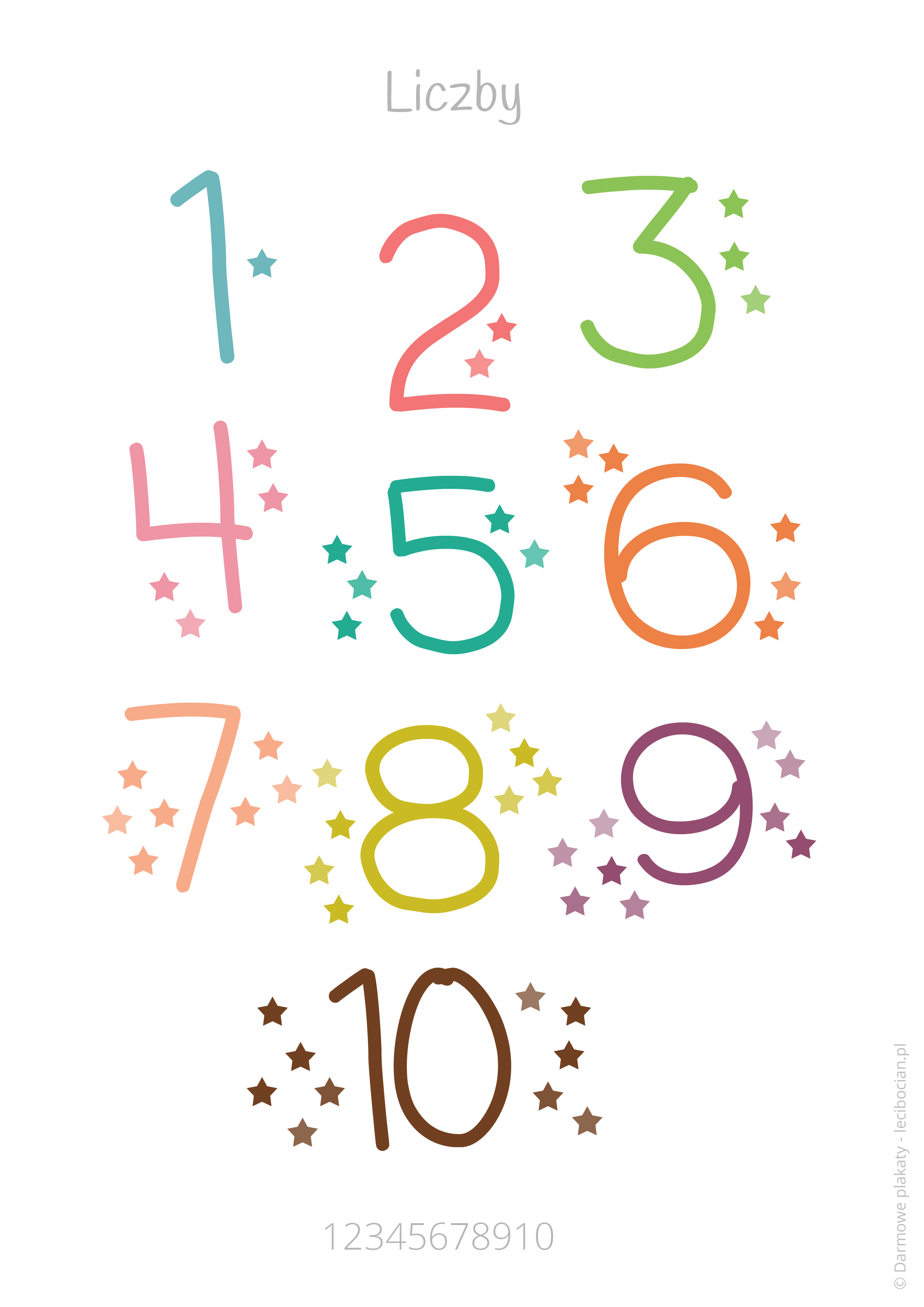 Darmowy plakat z kolorowymi liczbami i cyframi do druku. Pobierz kolorowy plakat do pokoju dziecka, który pomoże w nauce liczenia, a przy okazji jest piękną ozdobą dziecięcego pokoju.