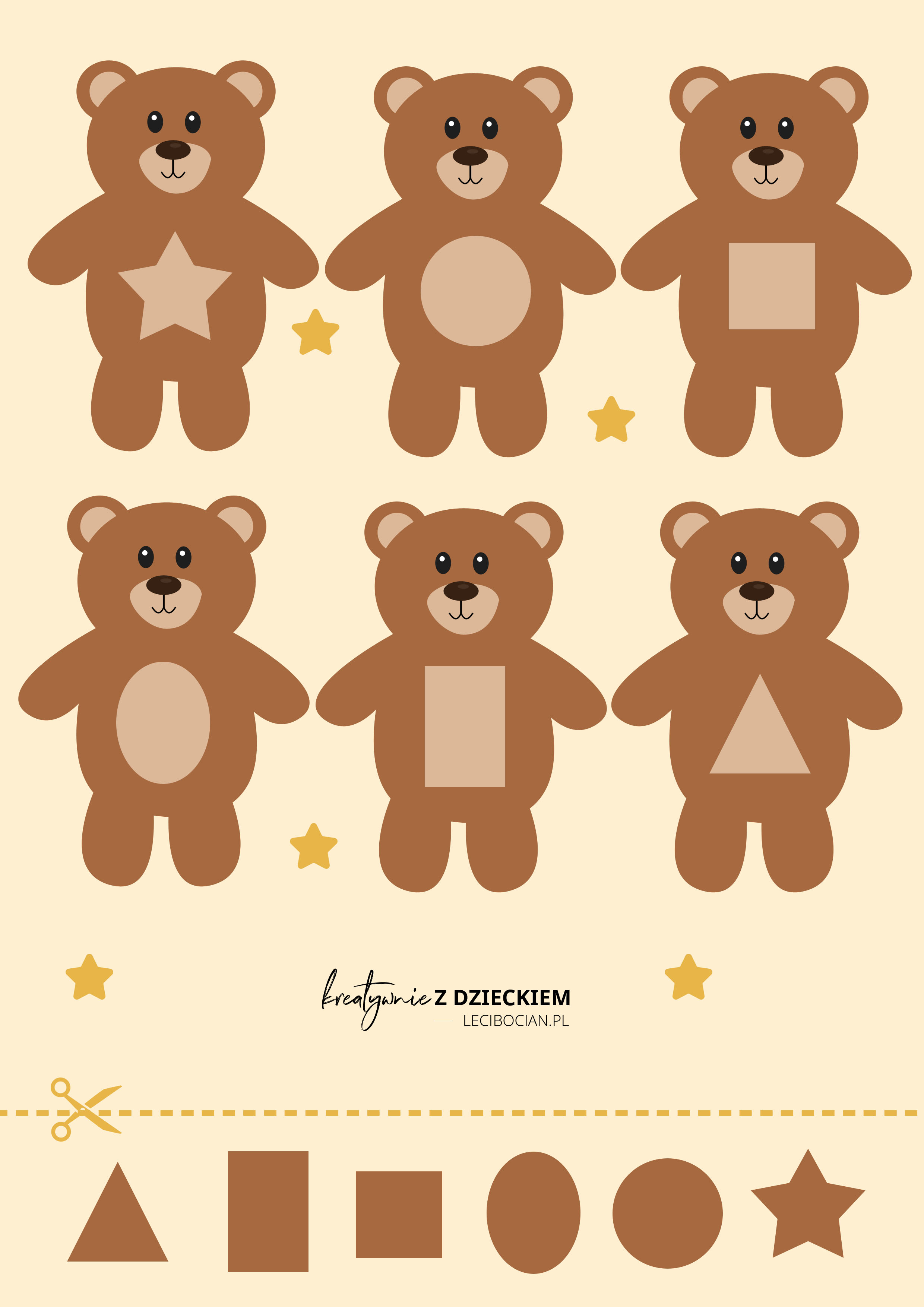 Na tej karcie pracy zadaniem dziecka jest wycięcie kształtów i wklejenie ich w odpowiednie miejsca na brzuszkach pluszowych misiaków.