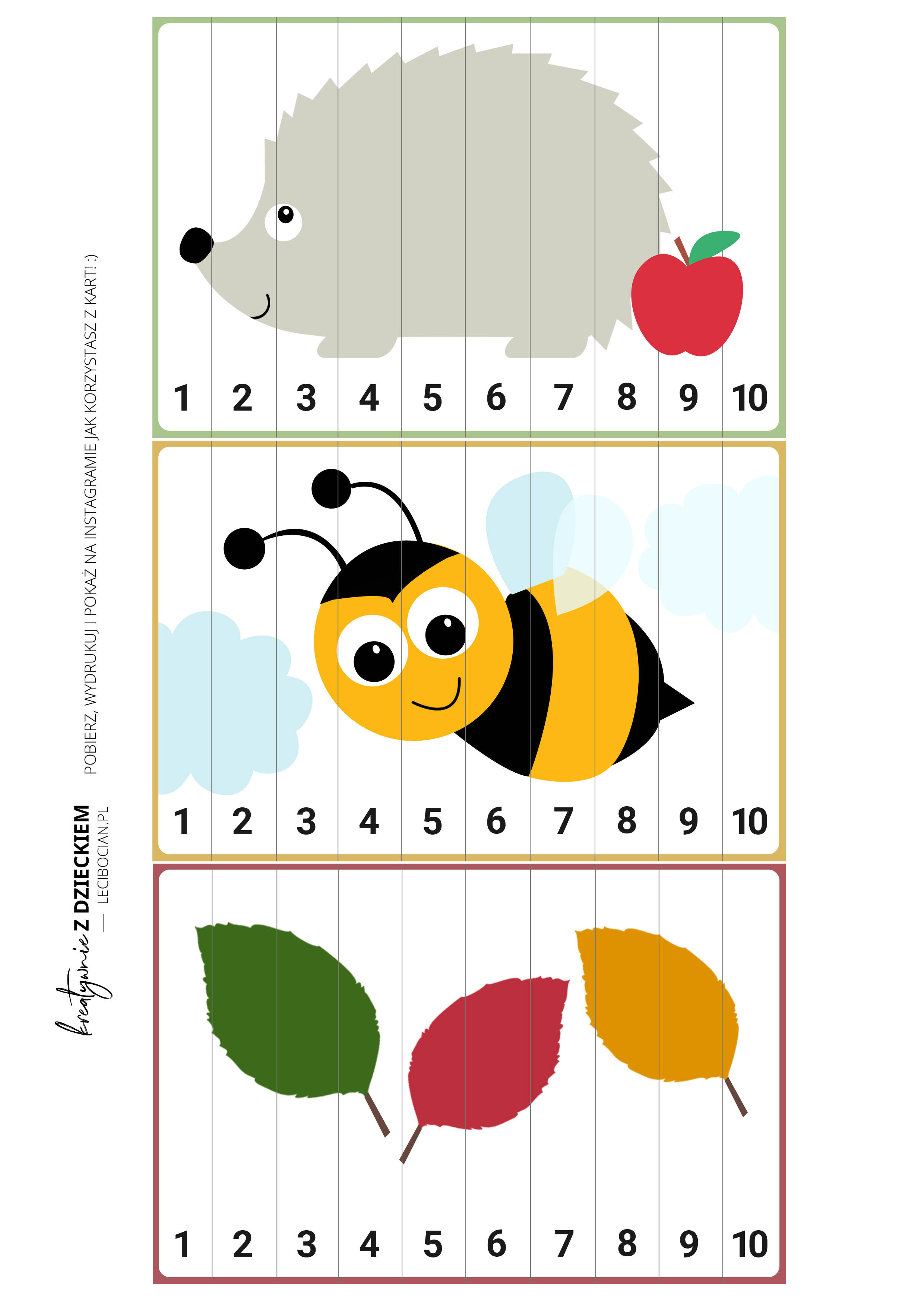 Przygotowałam dla Was matematyczne puzzle, dzięki którym dziecko nauczy się cyferek od 1 do 10. Na puzzlach znalazły się jesienne motywy takie jak jeżyk i liście, dlatego możecie je również wykorzystać jako jesienne karty pracy.