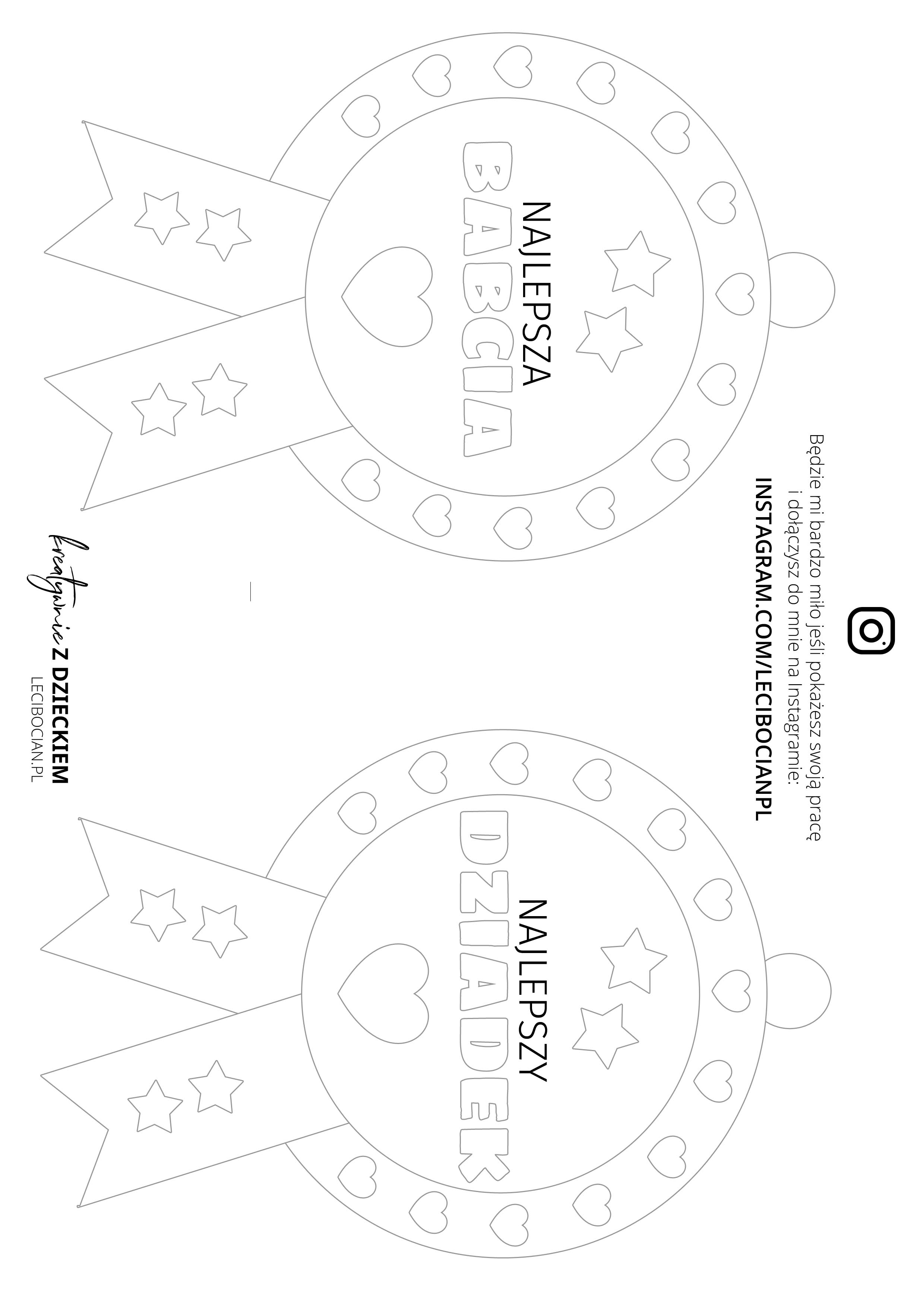 Pierwszym pomysłem na prezent dla dziadków są wyjątkowe medale. Jeden dla najlepszej babci i drugi dla dziadka. Medale możecie wydrukować i ozdobić na różne sposoby. Można pomalować je kredkami lub farbami, ale również można poszaleć z np. z brokatem. Sposób ich wykonania możecie dostosować do umiejętności dziecka. Tak, aby był to prezent własnoręcznie wykonany.