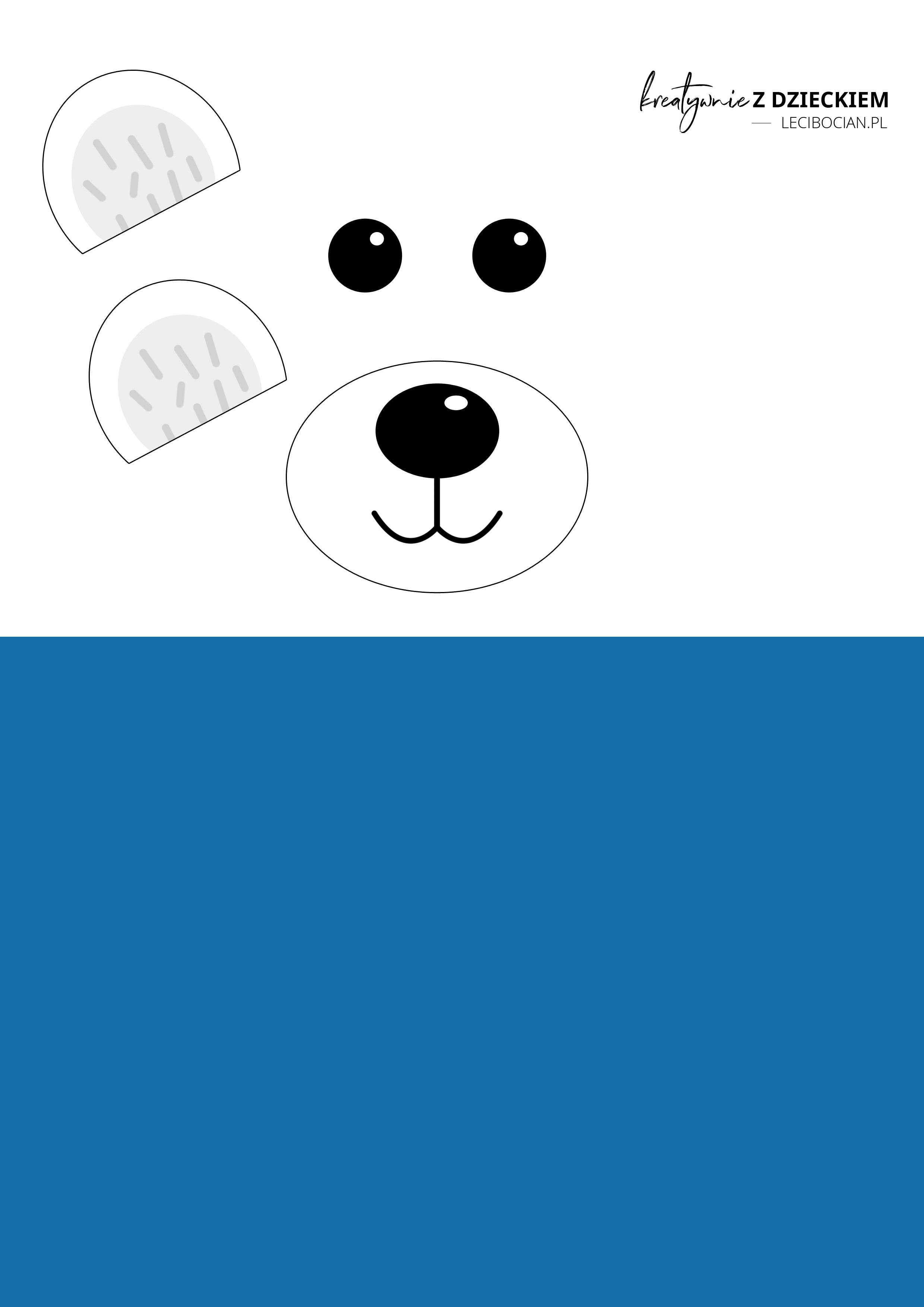 Tego niedźwiedzia polarnego zrobiliśmy z Igorem z pomocą szablonu, w którym znajdziecie nos, oczy, uszy oraz niebieską planszę, na której zrobiliśmy niedźwiedzia. Darmowy szablon możecie pobrać na dole wpisu i wydrukować.