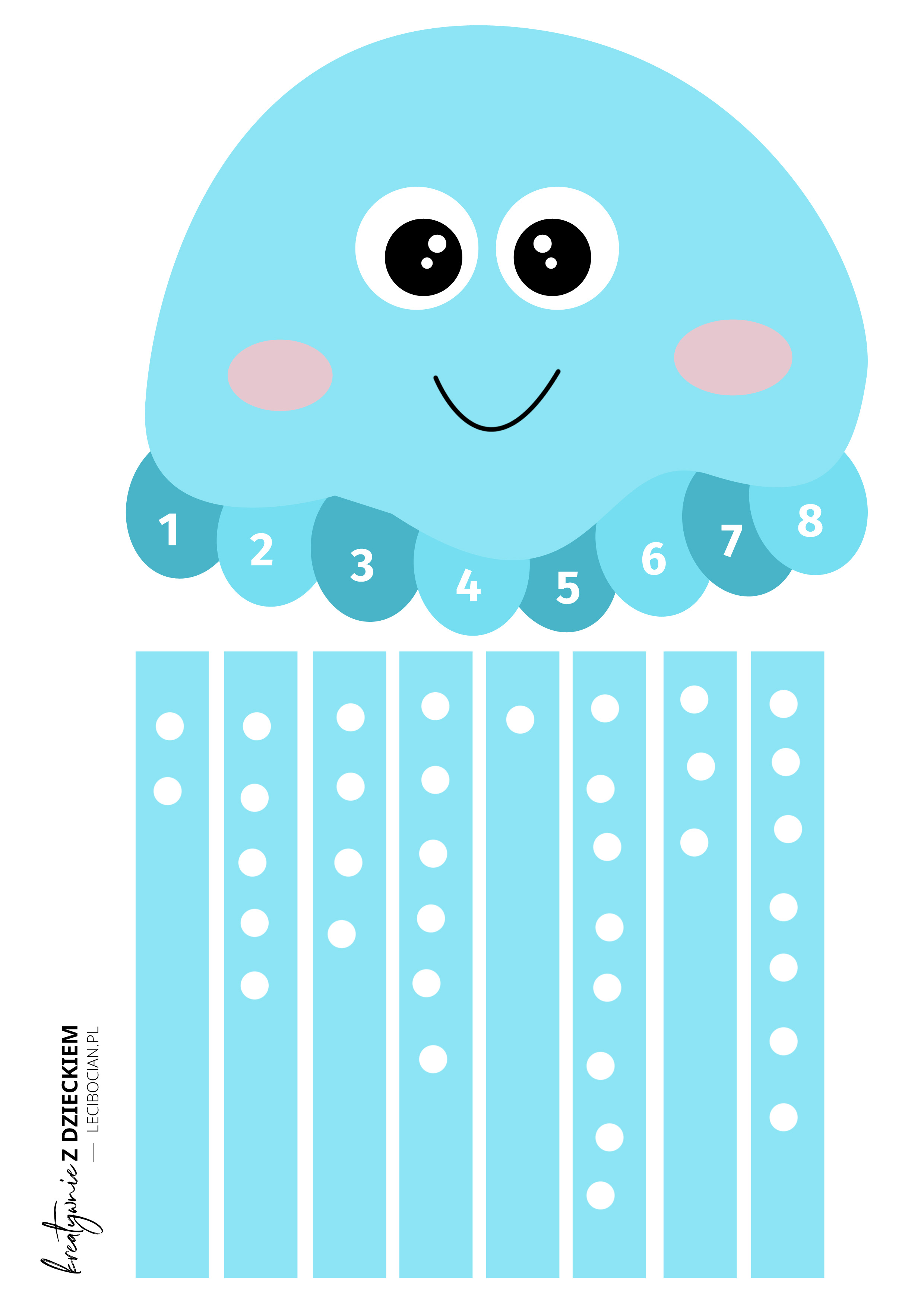 Pierwsza ośmiornica pomoże Waszym dzieciom nauczyć się kolorów, bo jej macki należy przykleić zgodnie z kolorami. Druga to fajny pomysł na naukę liczenia, bo macki przyklejamy zgodnie z cyframi, które znajdują się na ośmiornicy. Aby przykleić je w odpowiednie miejsca należy policzyć kropki i przykleić je pod odpowiednią cyfrą. To nie tylko zabawa dla starszych dzieci, które radzą sobie z wycinaniem, ale również dla tych młodszych – im możemy przygotować wycięte elementy, a ich zadaniem będzie dopasowanie ich w odpowiednie miejsca.