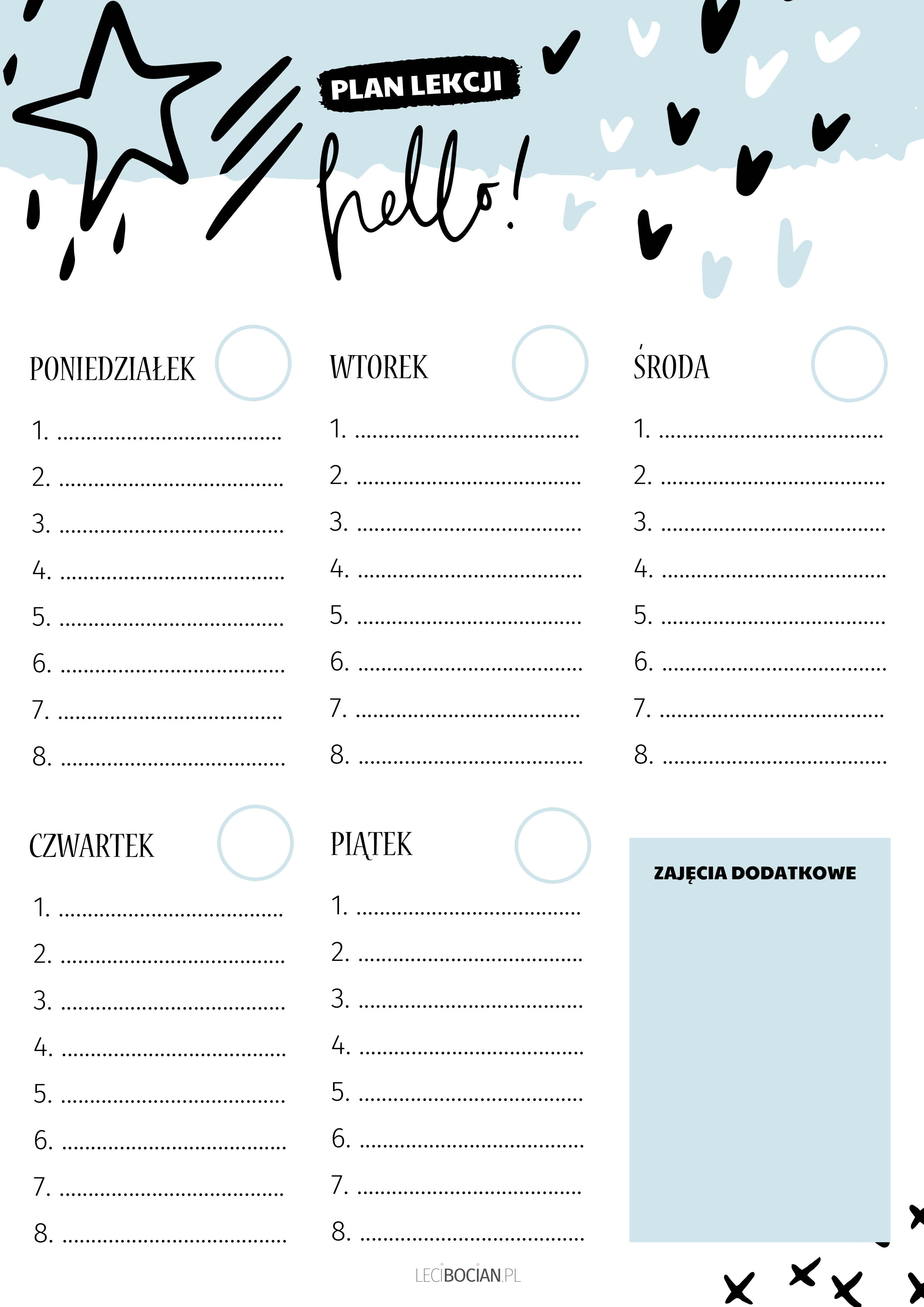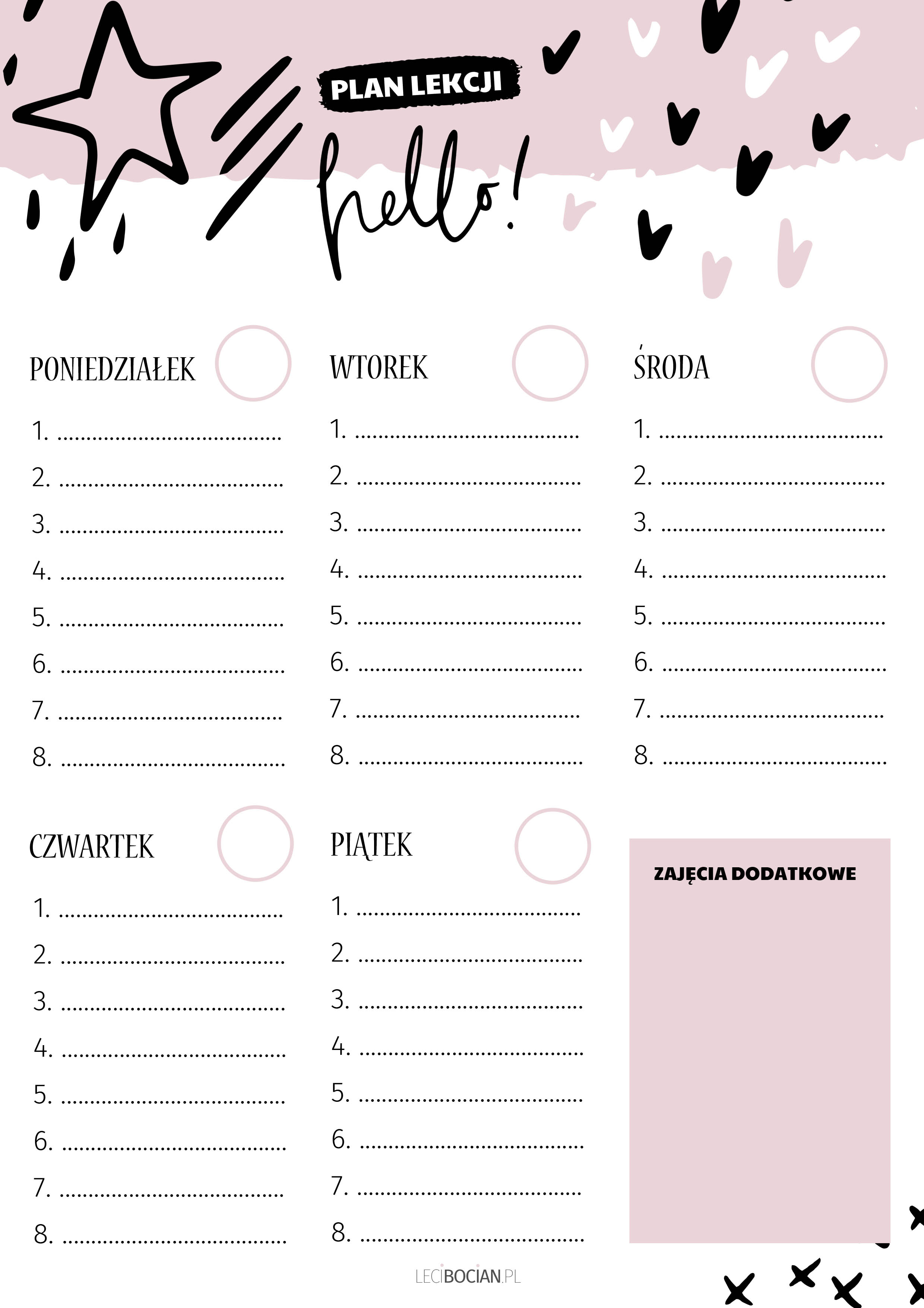 Plany lekcji przygotowałam dla Was w dwóch pastelowych kolorach: różowym i niebieskim. Znajdziecie w nim miejsce na rozpisanie lekcji w od poniedziałku do piątku, a także miejsce na zajęcia dodatkowe. Przy każdym dniu jest również miejsce na wpisanie godziny, o której zaczynają się lekcje w danym dniu. Chciałam żeby były one dosyć uniwersalne i pasowały zarówno dla młodszych jak i starszych uczniów. Mam nadzieję, że mi się to udało!