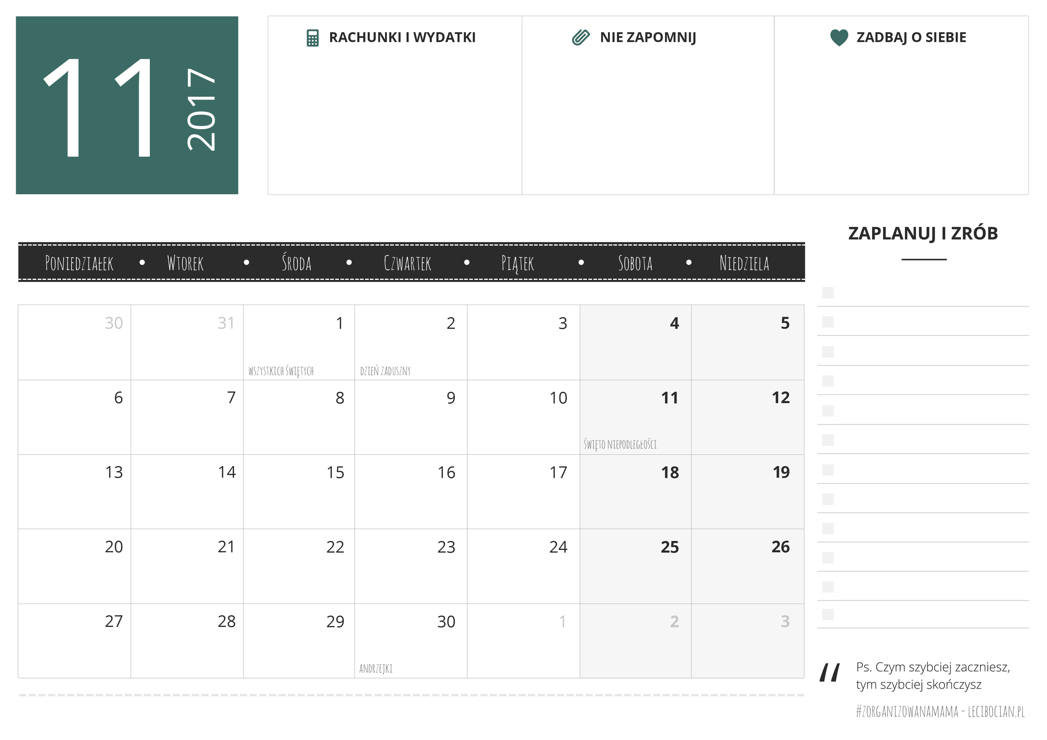Planer do druku na listopad 2017 do pobrania za darmo. Pobierz miesięczny planer z miejscem na ważne notatki, listą zadań do wydrukowania!