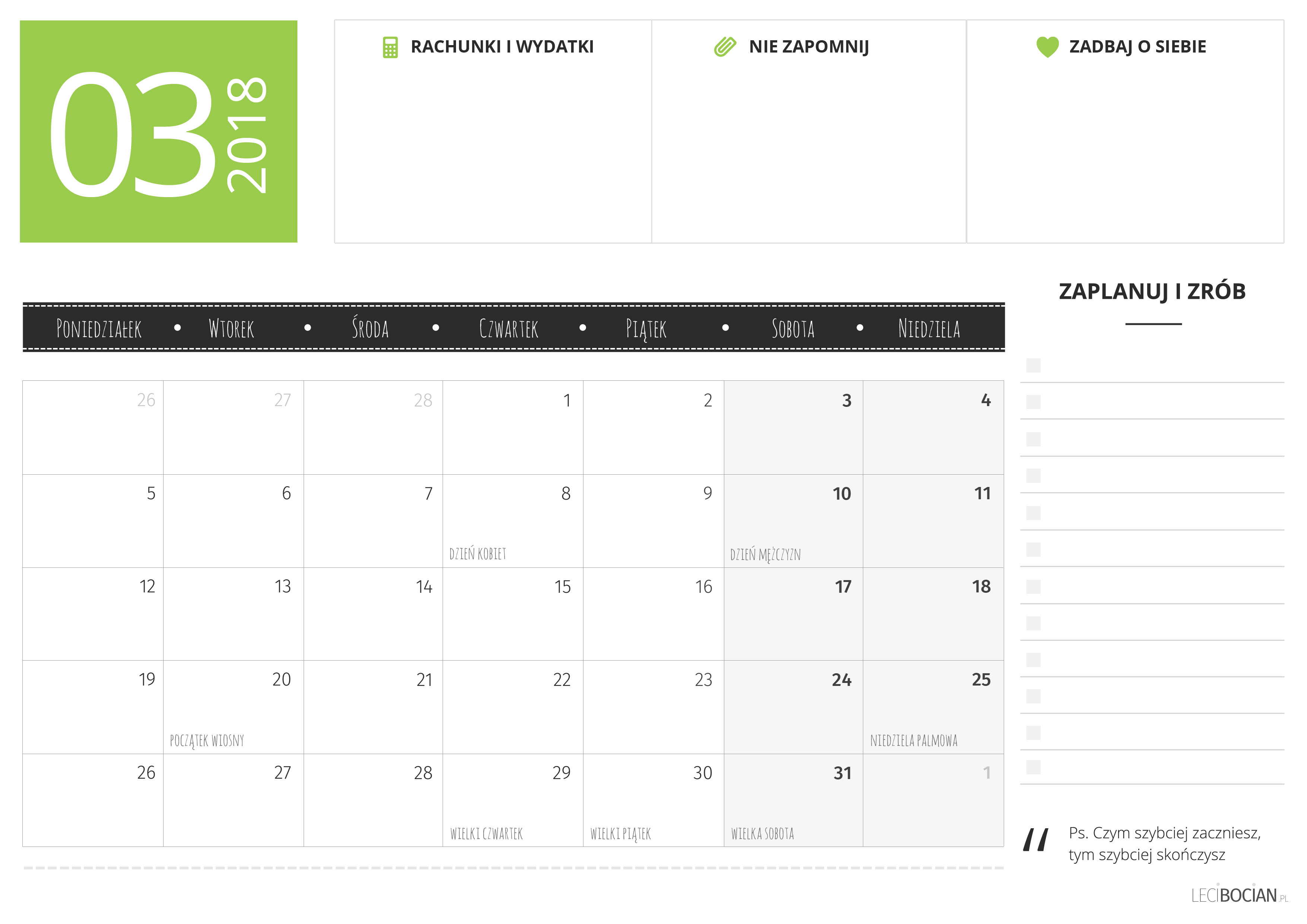 Darmowy planer do druku marzec 2018 do pobrania za darmo. Pobierz miesięczny planner z miejscem na ważne notatki, listą zadań do wydrukowania!