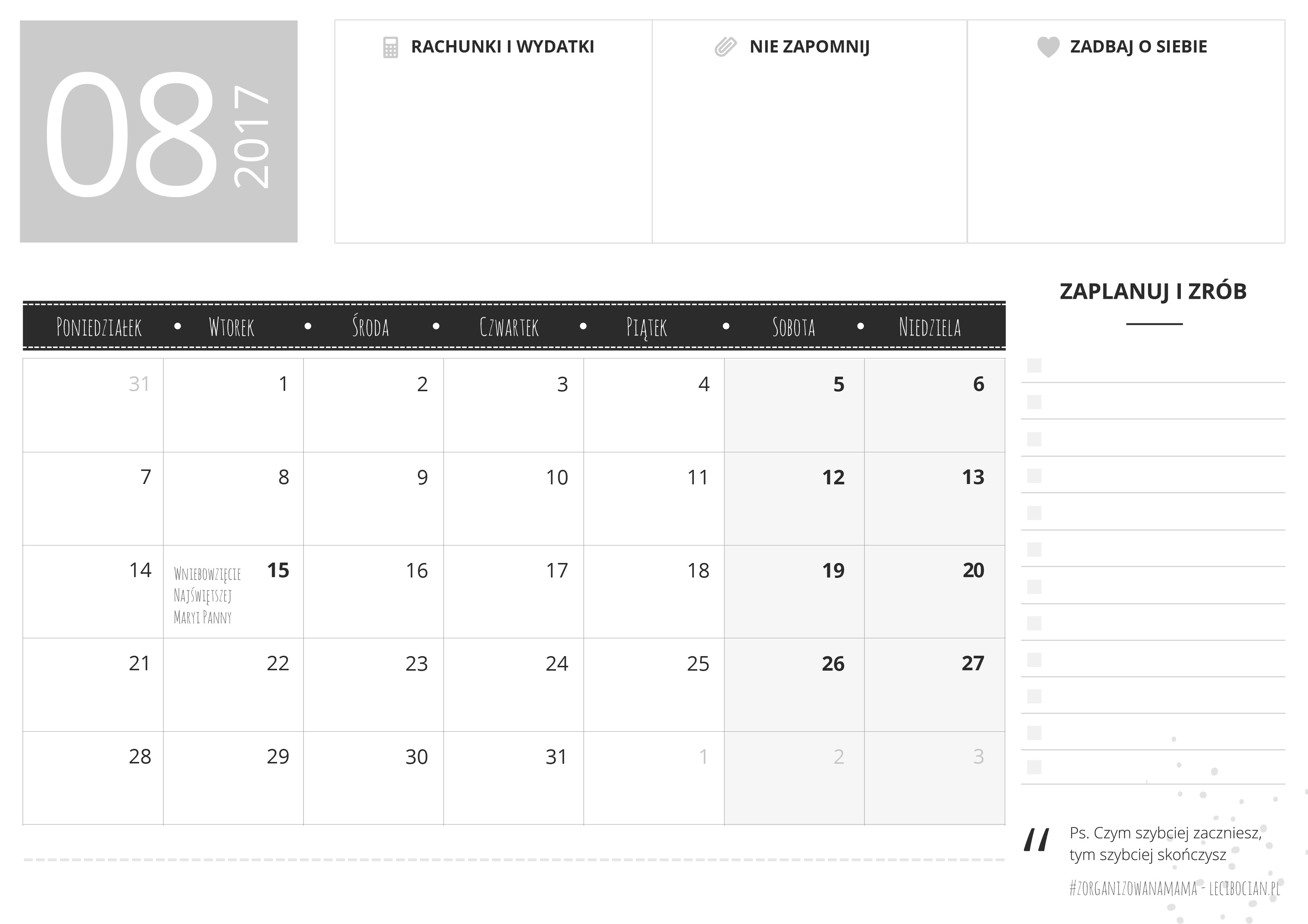 Planer do druku na sierpień 2017 – pobierz i wydrukuj. Miesięczny planer z miejscem na ważne notatki, listą zadań do wydrukowania!