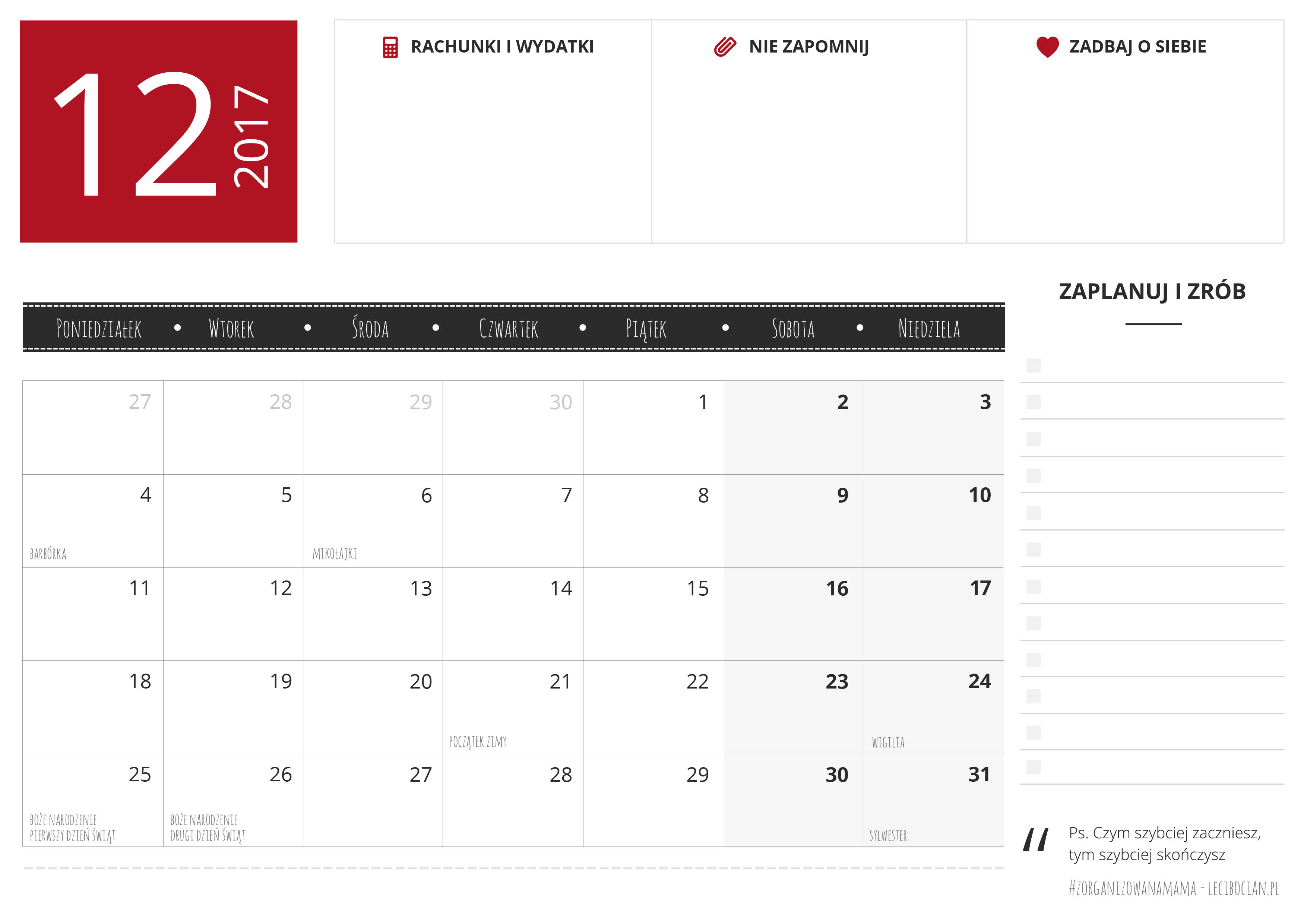 Planer do druku na grudzień 2017 do pobrania za darmo. Pobierz darmowy miesięczny planer z miejscem na ważne notatki, listą zadań do wydrukowania!