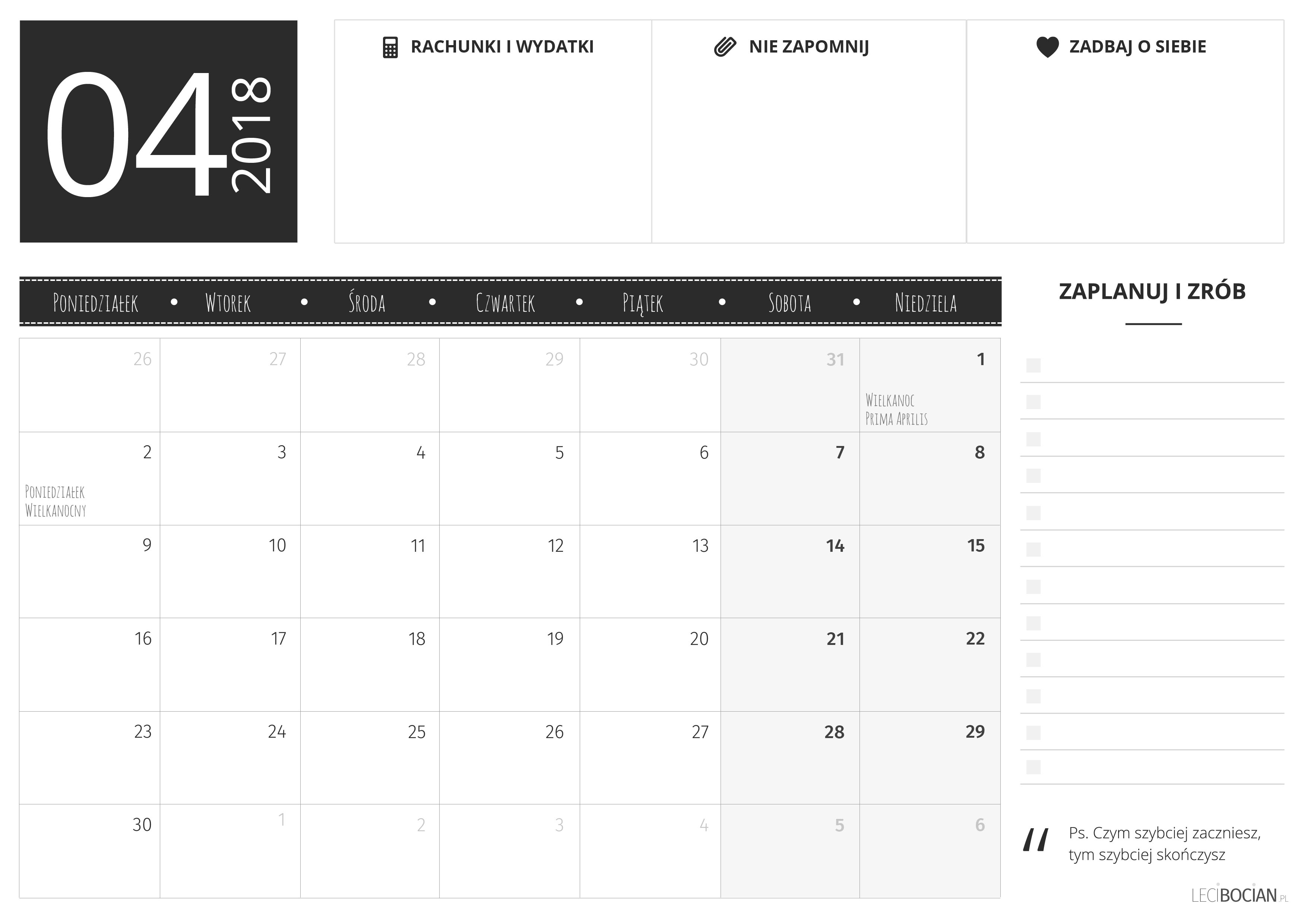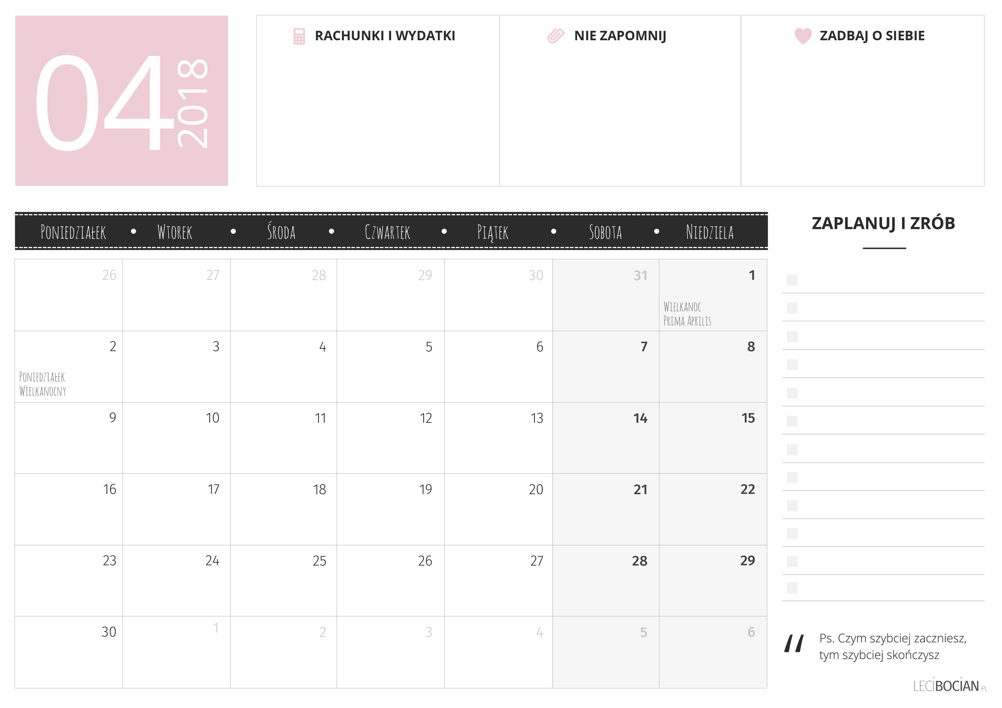 Darmowy planer do druku kwiecień 2018 do pobrania za darmo. Pobierz miesięczny planner z miejscem na ważne notatki, listą zadań do wydrukowania!