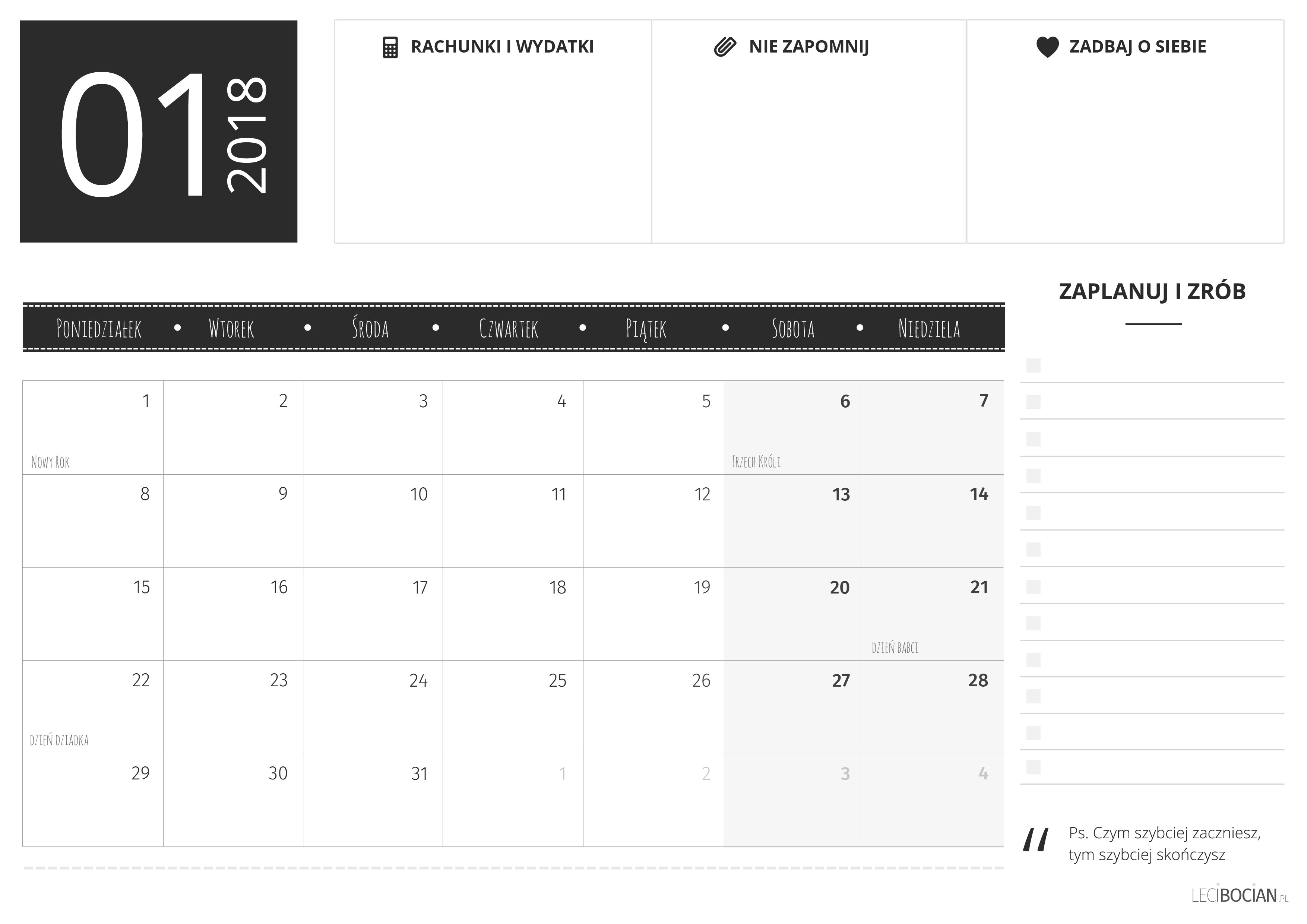 Planer do druku na styczeń 2018 do pobrania za darmo. Pobierz darmowy miesięczny planer z miejscem na ważne notatki, listą zadań do wydrukowania!