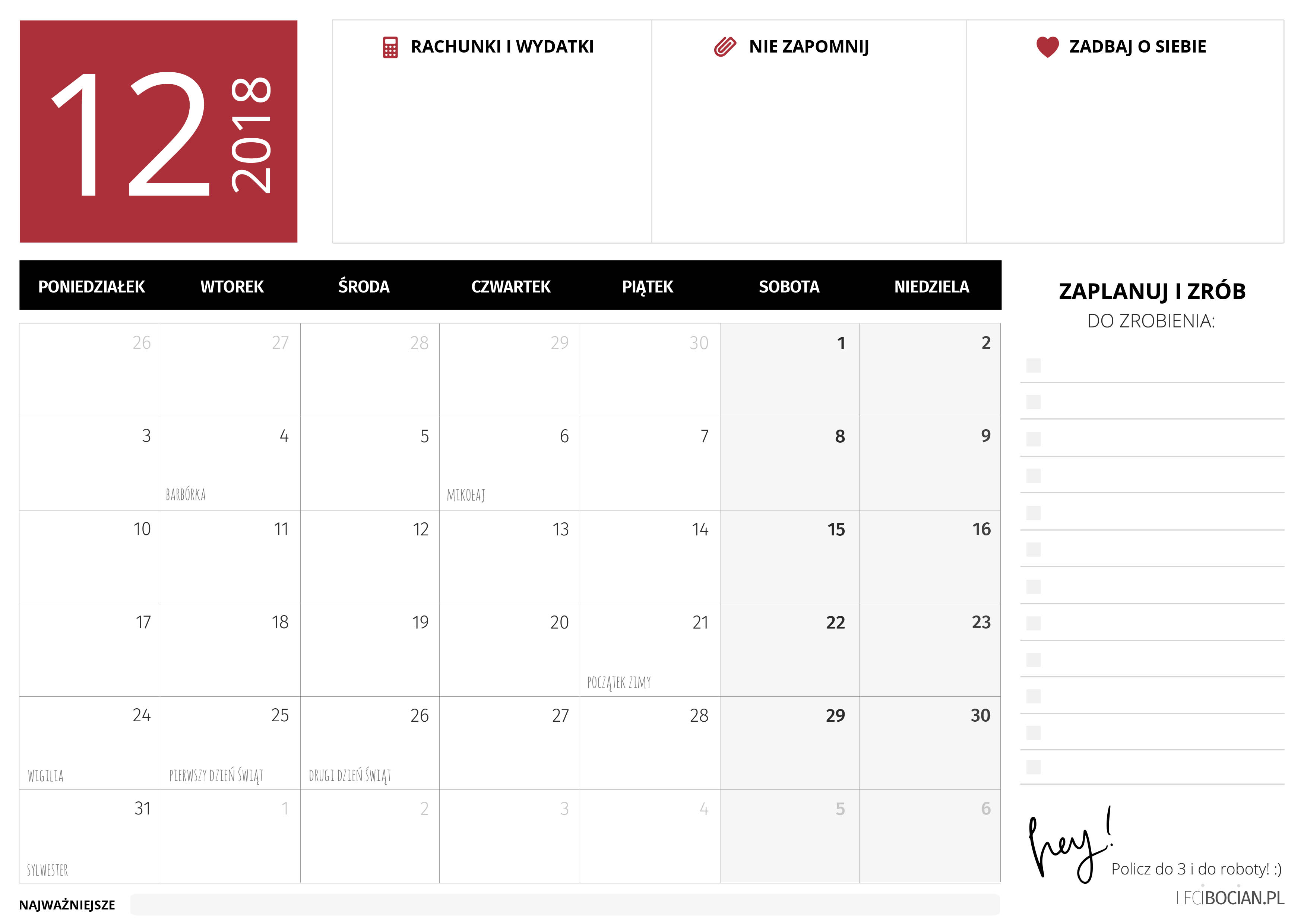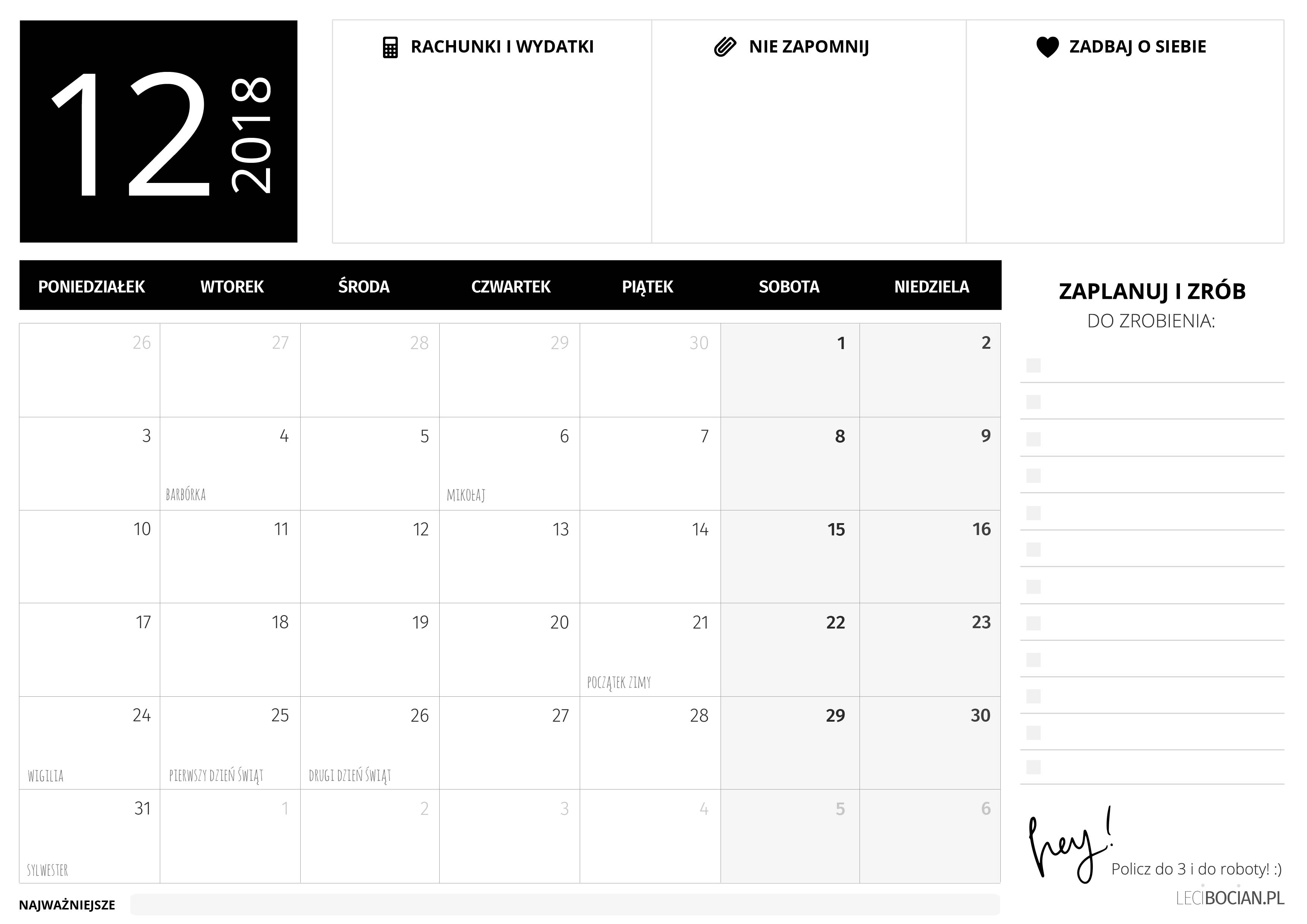 Miesięczny grudniowy planer przygotowałam dla Was w wersji czarno-białej i czerwonej. Święta to chyba jedyny okres, w którym lubię taką kolorystykę. Na planerze znajdziecie Wasze ulubione pozycje: kalendarz z dużą ilością miejsca na notatki i zaznaczonymi najważniejszymi świętami. Jest lista najważniejszych rzeczy do zrobienia oraz miejsce na wpisanie wydatków, nie zapomnij i zadbaj o siebie.