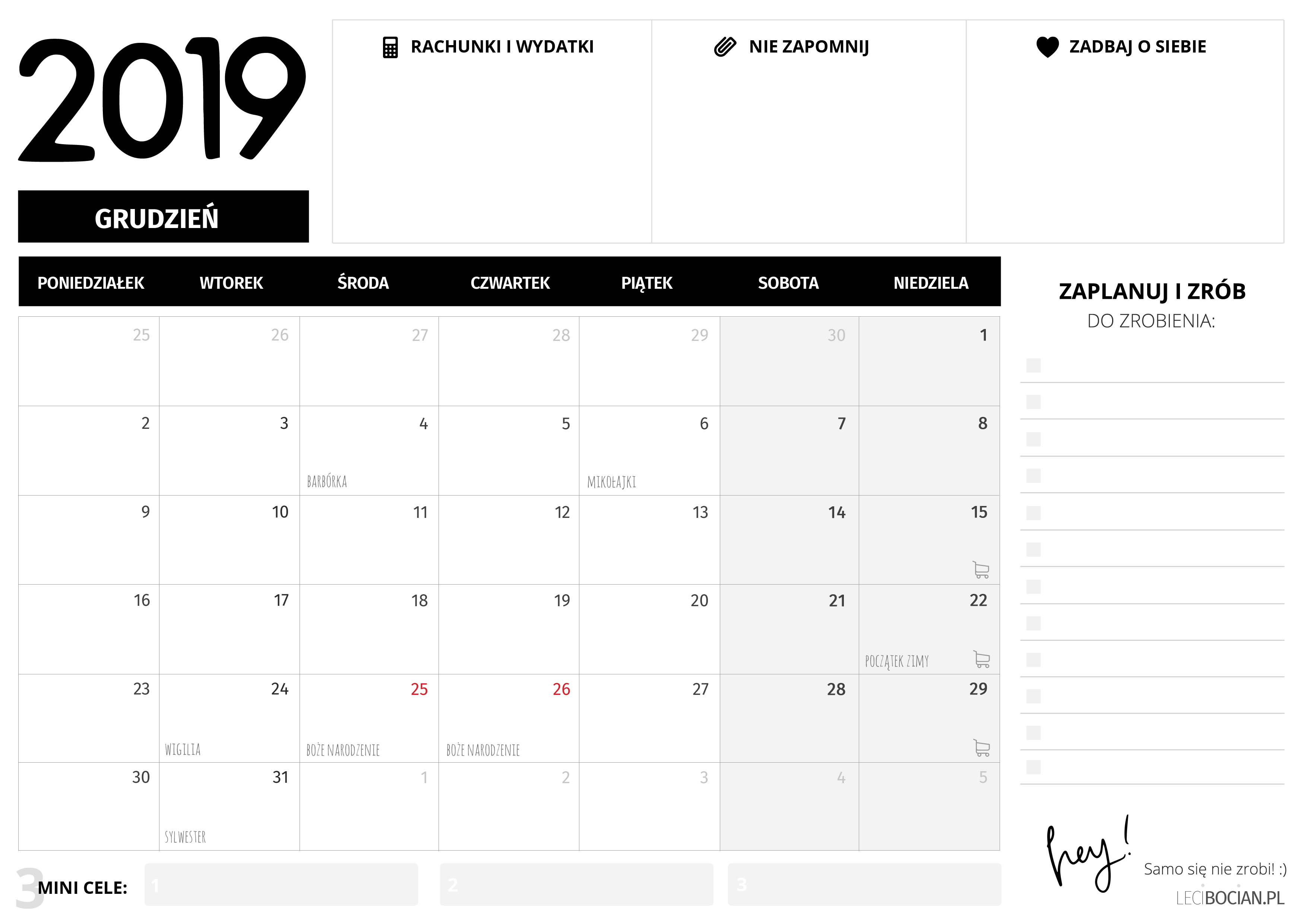 Planer grudzień 2019, czyli czas kolejny darmowy planer do druku. Zaplanuj grudzień w moim darmowym planerze do wydrukowania. Pobierz planer w ulubionym kolorze. Znajdziesz w nim kalendarz, listę rzeczy do zrobienia, miejsce na wydatki i ważne plany.