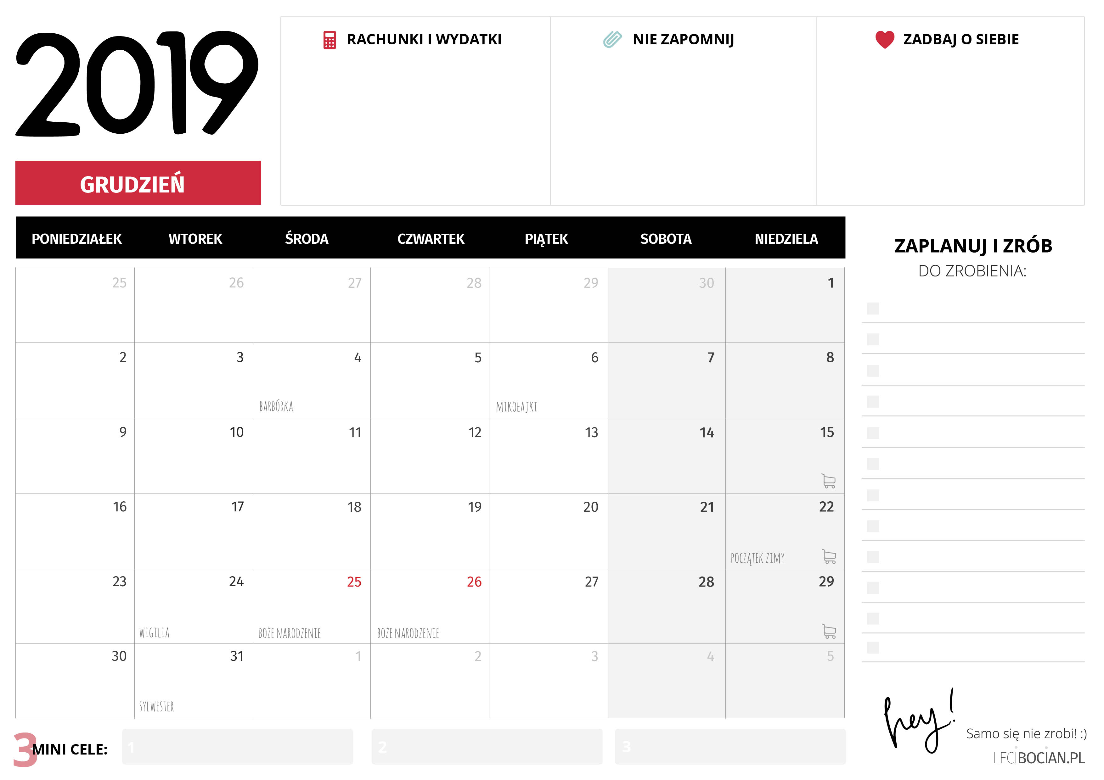 Mimo, że kolor jest bardziej świąteczny to forma i układ planera jest dokładnie taki jak lubicie. W moim miesięcznym planerze do druku jak co miesiąc znajdziesz czytelny kalendarz z miejscem na notatki. W planerze do druku jest listą rzeczy do zrobienia, 3 mini cele miesiąca i rubryki na wpisanie ważnych rzeczy (rachunki, nie zapomnij, zadbaj o siebie).