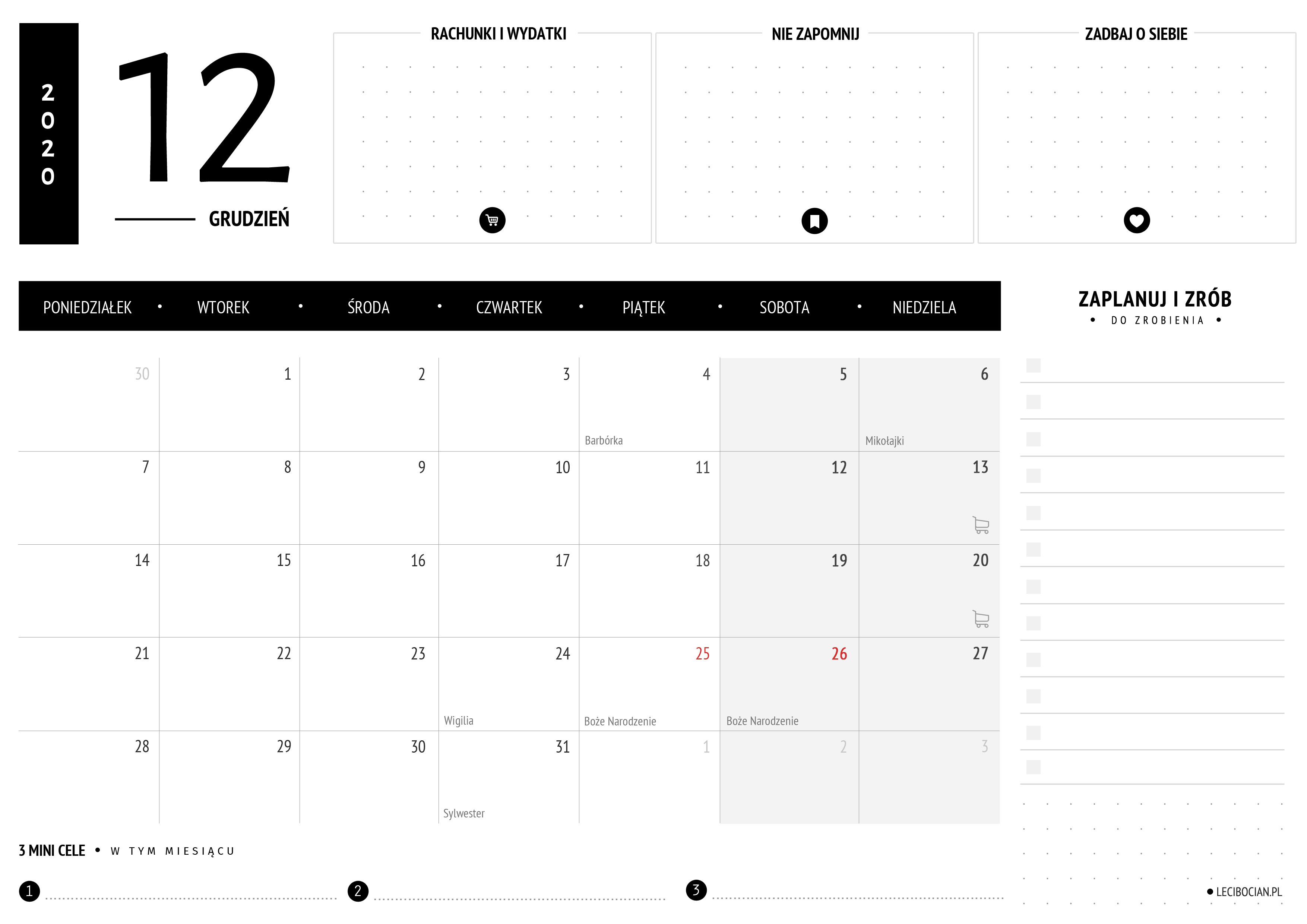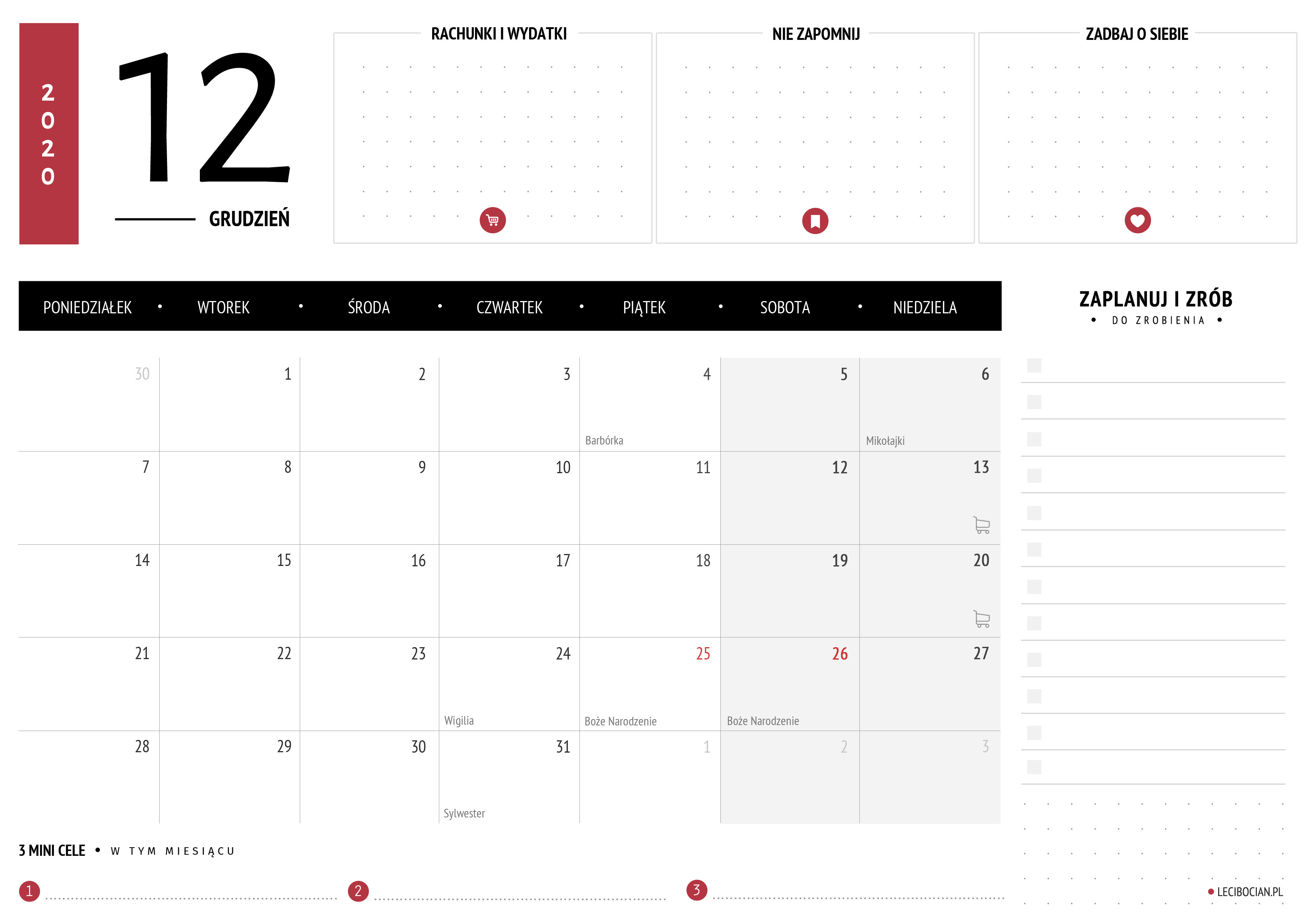 Darmowy planer grudzień 2020 do druku. Pobierz bezpłatny planer do wydrukowania na grudzień 2020. Miesięczny planer z listą zadań i ważnymi celami na grudzień! Wybierz swój planer i wydrukuj!