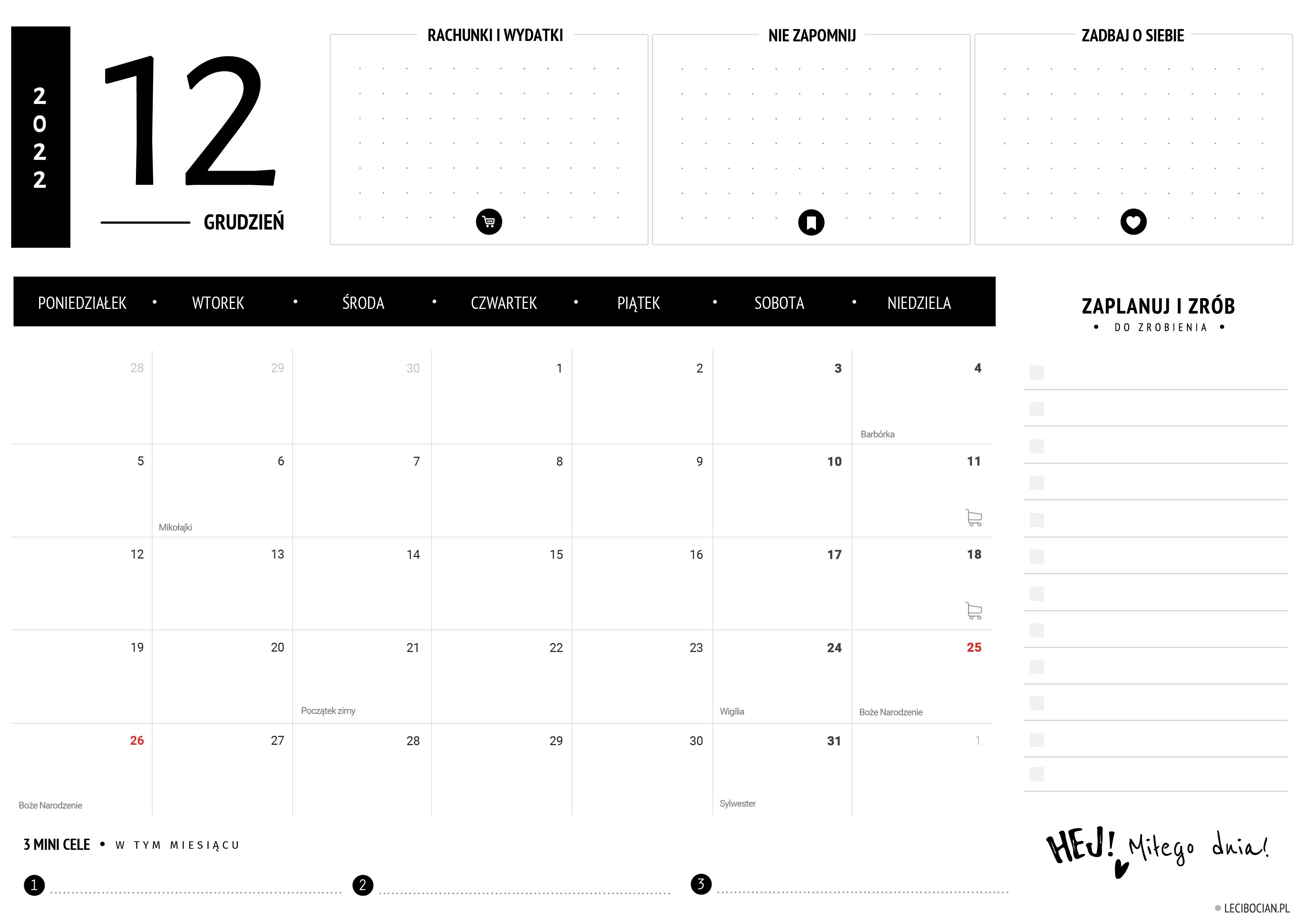 Darmowy planer grudzień 2022 do druku. Pobierz bezpłatny planer do wydrukowania na grudzień 2022. Miesięczny planer z listą zadań i ważnymi celami na grudzień! Wybierz swój planer i wydrukuj!