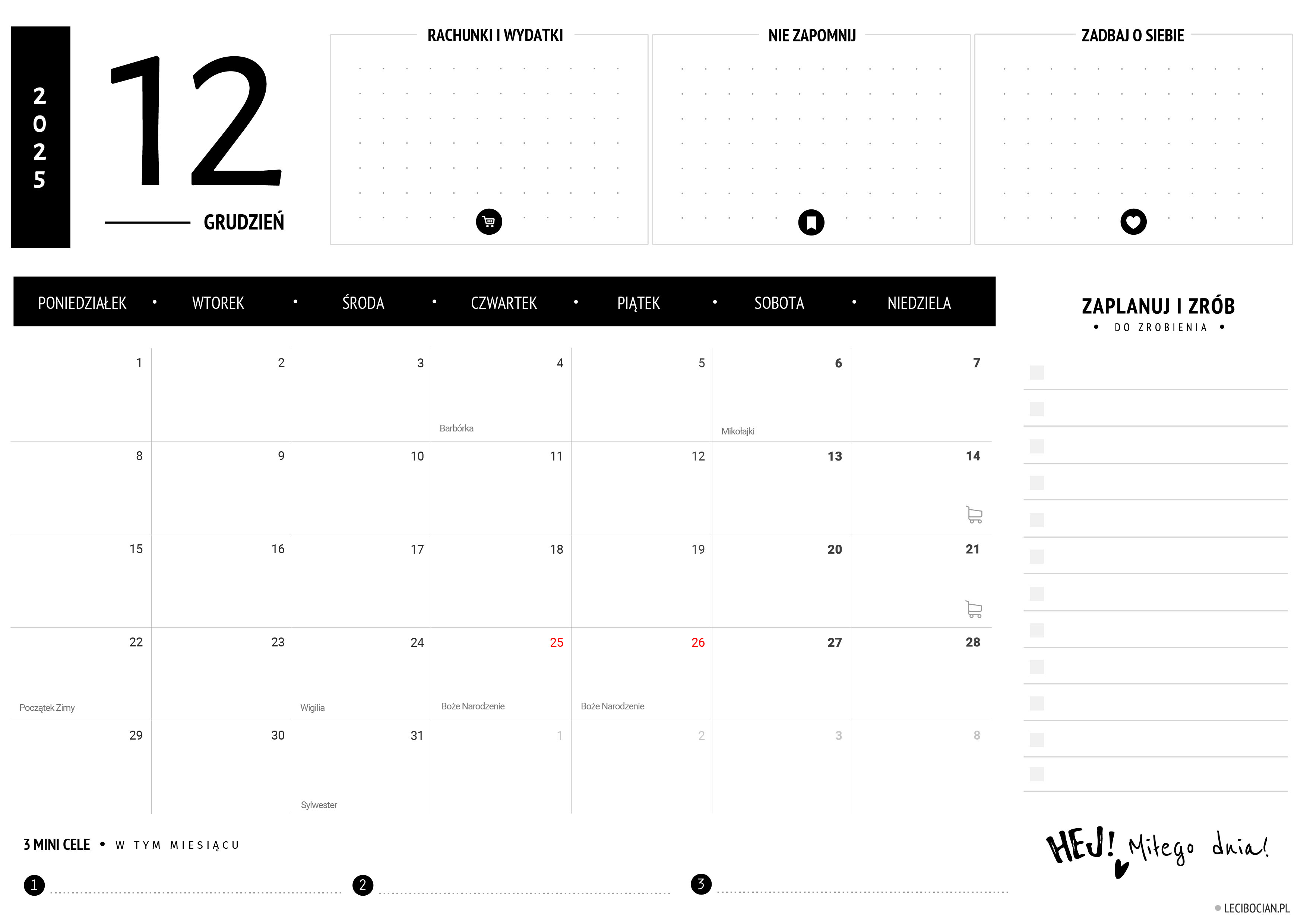 Darmowy planer grudzień 2025 do druku. Pobierz bezpłatny planer z kalendarzem na grudzień 2025 do wydrukowania. Lista zadań, cele miesiąca, czytelny kalendarz.
