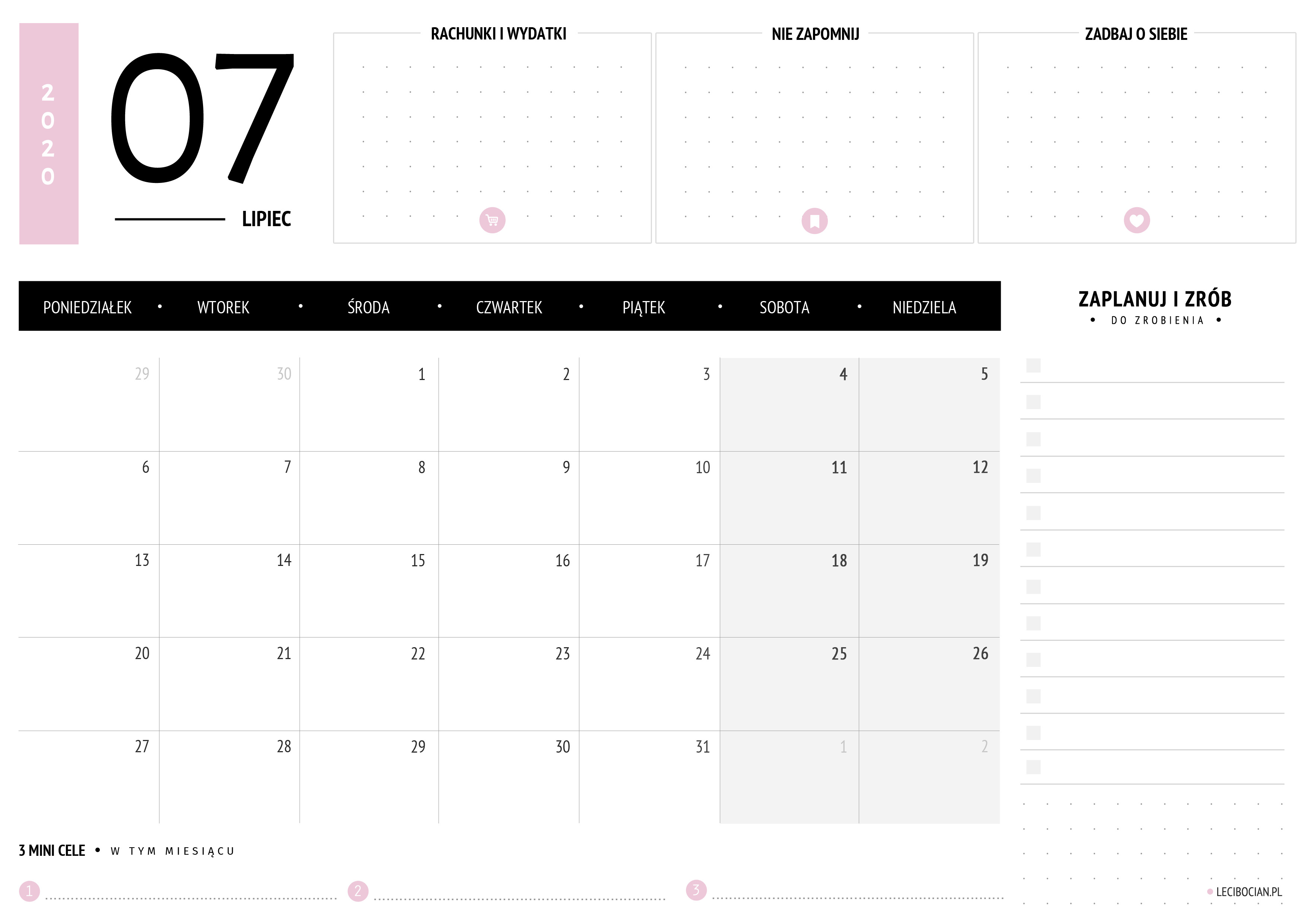 Wydrukuj je tyle razy ile potrzebujesz. Zorganizuj z nimi swoje domowe i zawodowe obowiązki. Zaplanuj kolejny miesiąc z czytelnym kalendarzem. Znajdziesz w nim dużo miejsca na notatki oraz praktyczną listę zadań. 3 mini cele miesiąca pomogą Ci wyznaczyć cele na lipiec, a dodatkowe rubryki pozwolą zadbać o Twoje zdrowie i finanse. Jeśli potrzebujesz więcej miejsca na swoje plany to sprawdź również mój datowany planer na lipiec, w którym znajdziesz aż 5 planerów na każdy tydzień lipca.