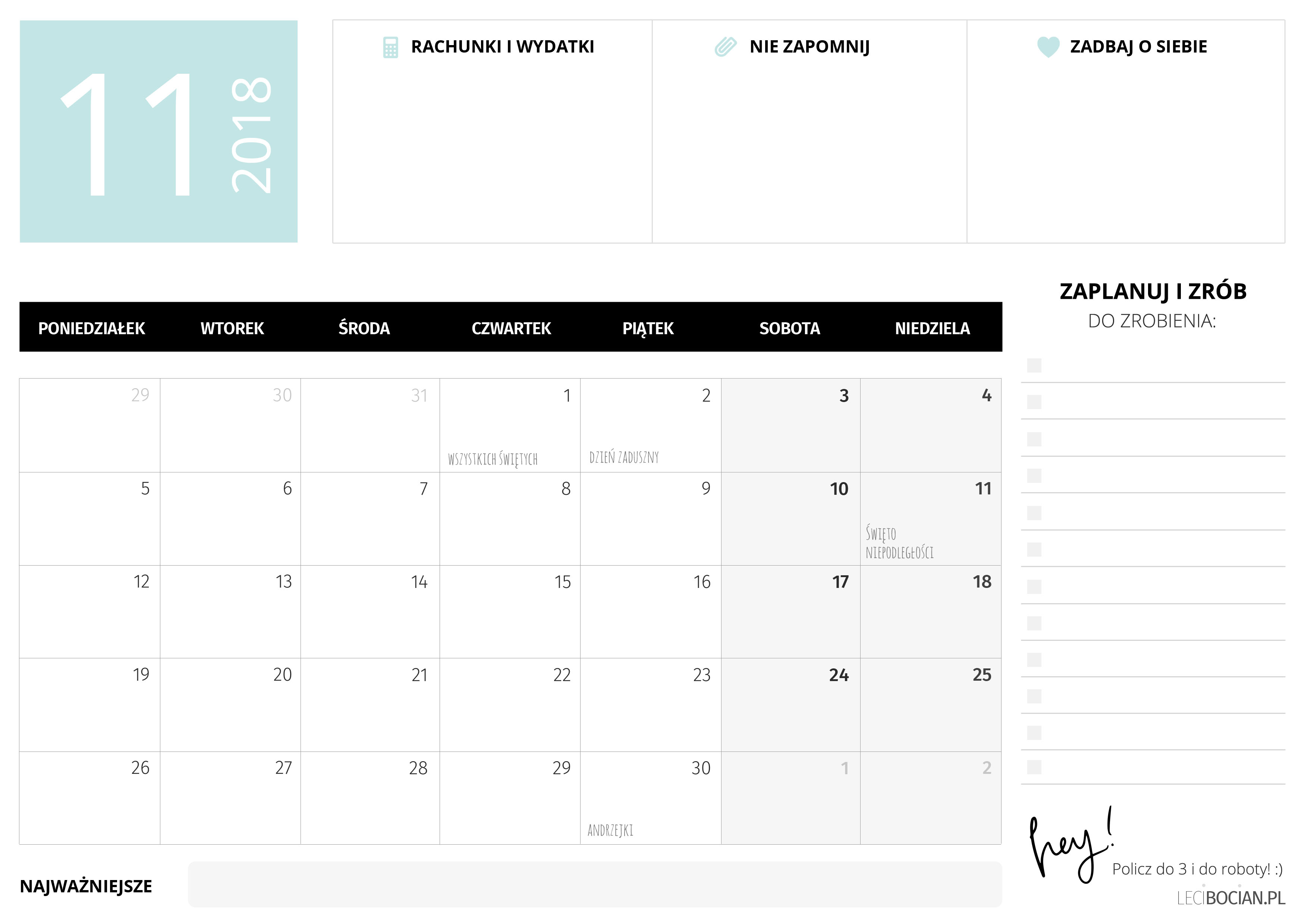 Planer do druku na listopad 2018 w dwóch kolorach do wyboru. Pobierz miesięczny darmowy planer na listopad 2018 z miejscem na ważne notatki i listą zadań do wydrukowania!