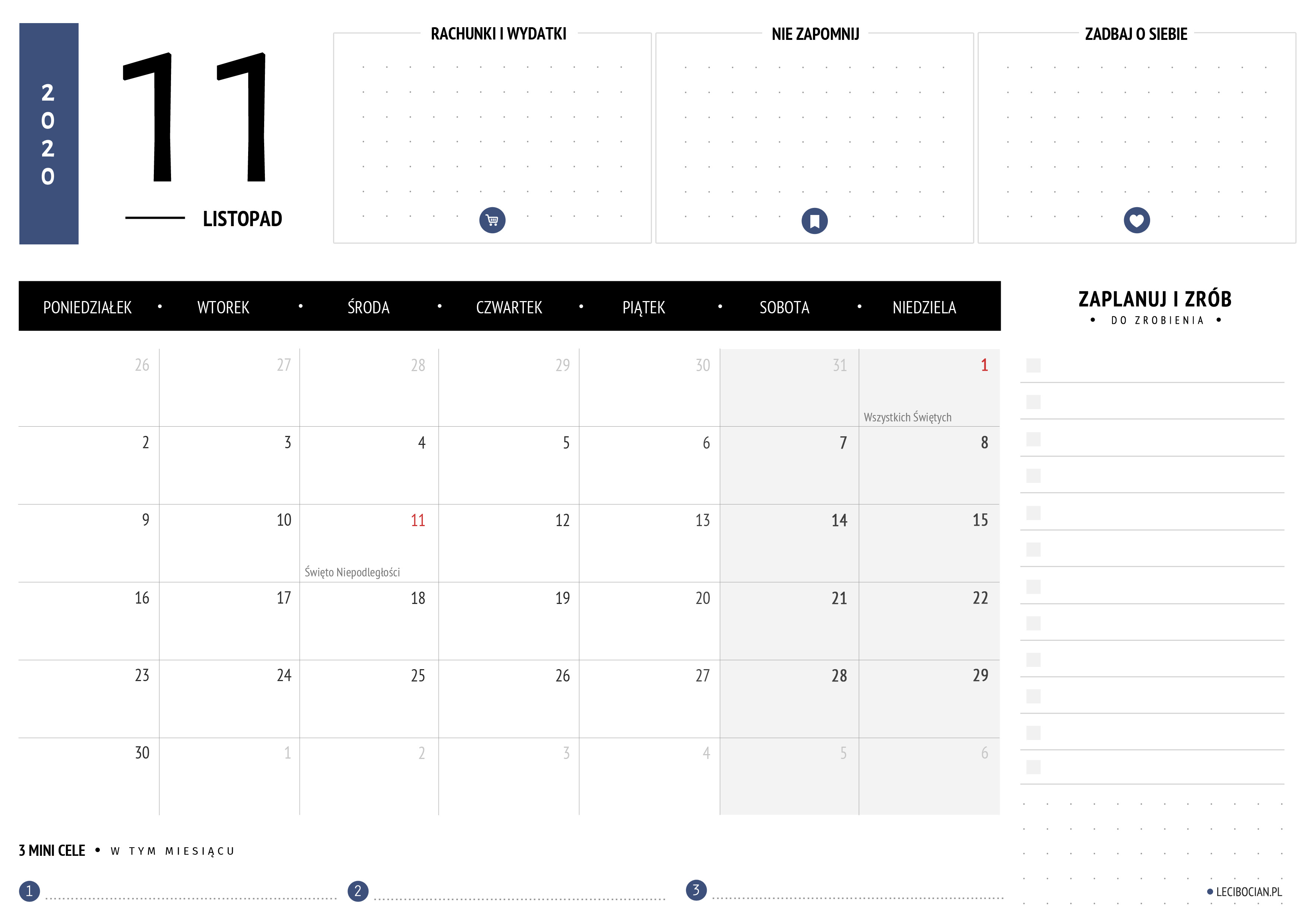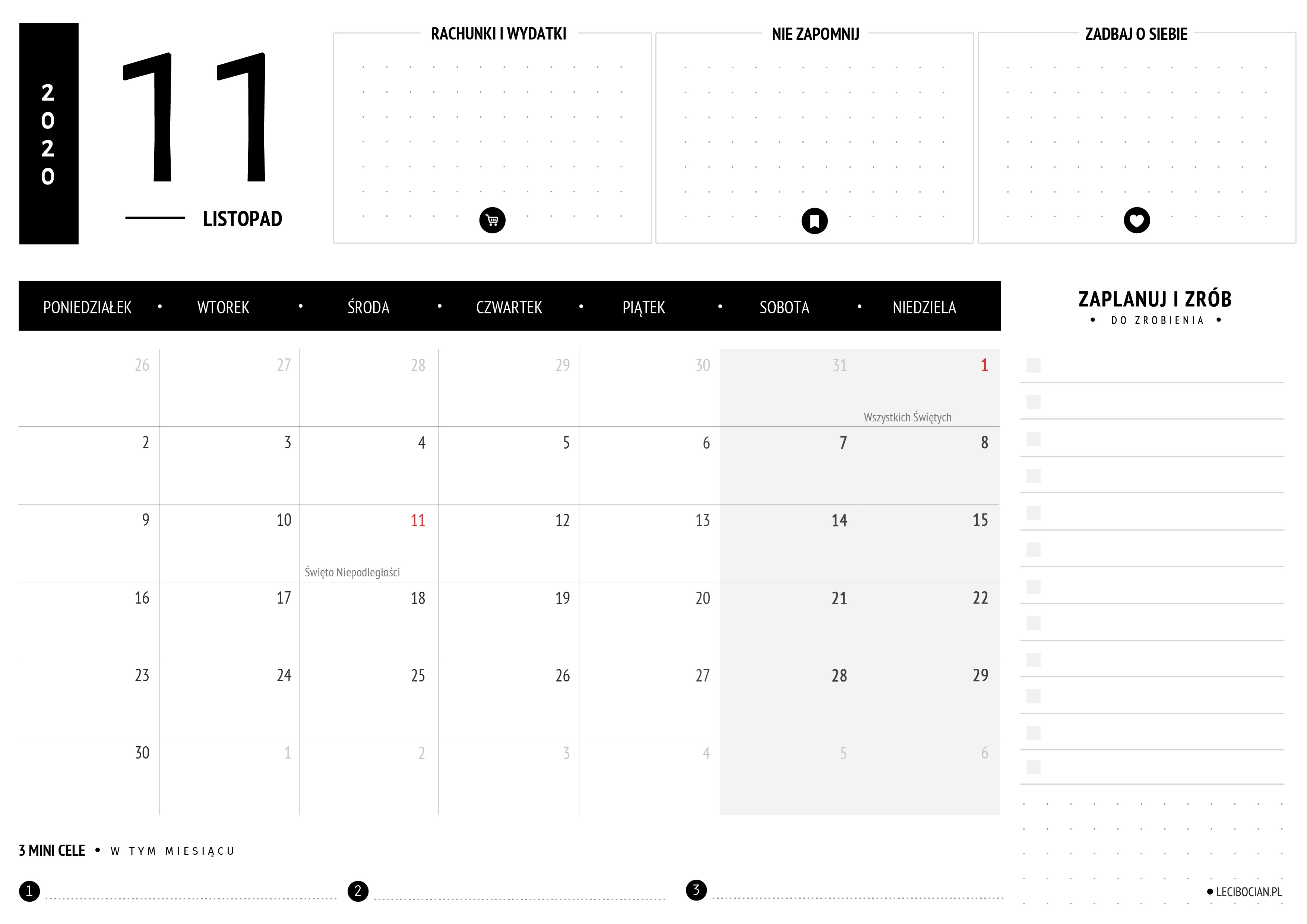 Darmowy planer listopad 2020 do druku. Pobierz bezpłatny planer do wydrukowania na listopad 2020. Miesięczny planer z listą zadań i ważnymi celami na listopad! Wybierz swój planer i wydrukuj!