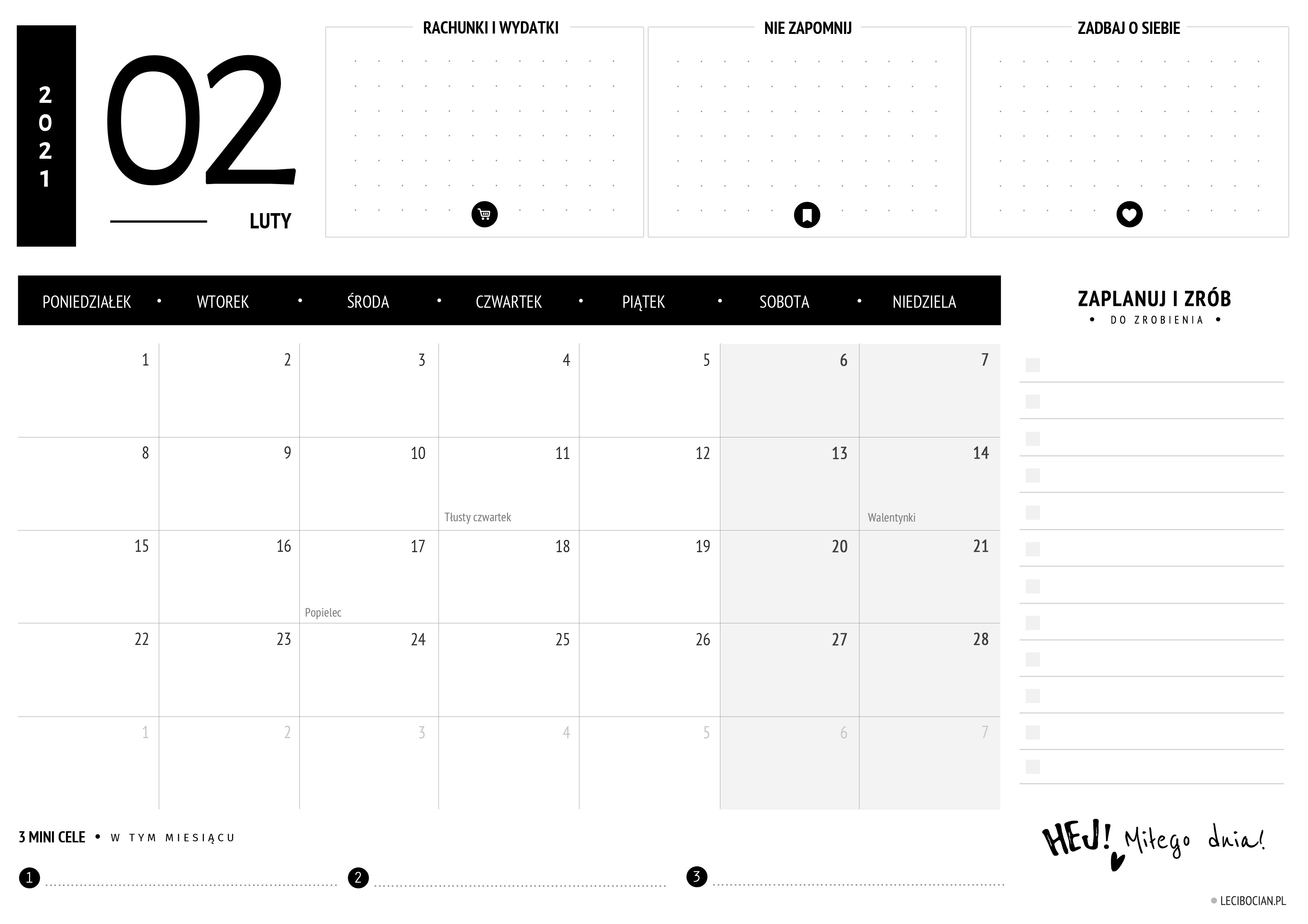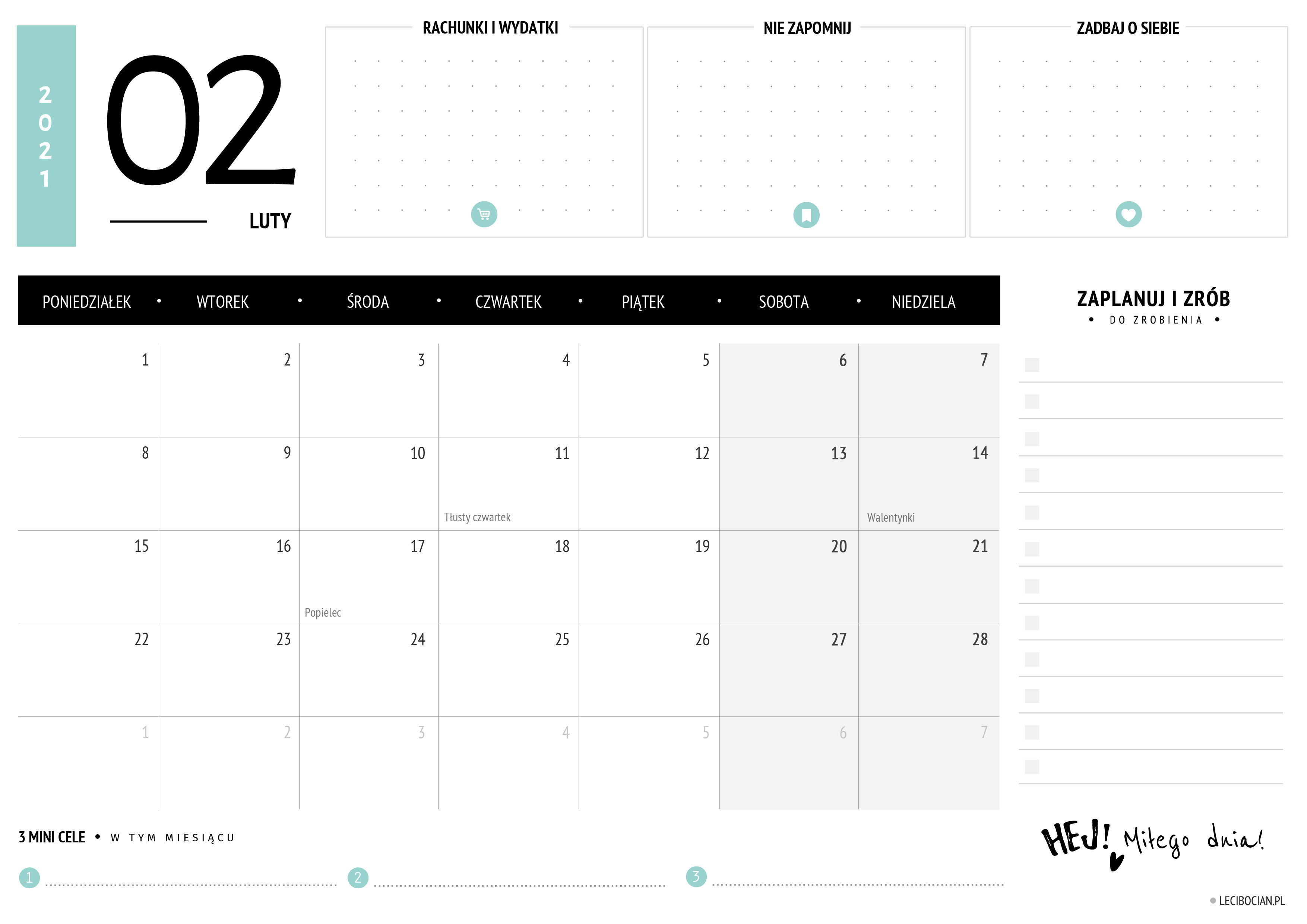 Darmowy planer luty 2021 do druku. Pobierz bezpłatny planer do wydrukowania na luty 2021. Miesięczny planer z listą zadań i ważnymi celami na luty! Wybierz swój planer i wydrukuj!
