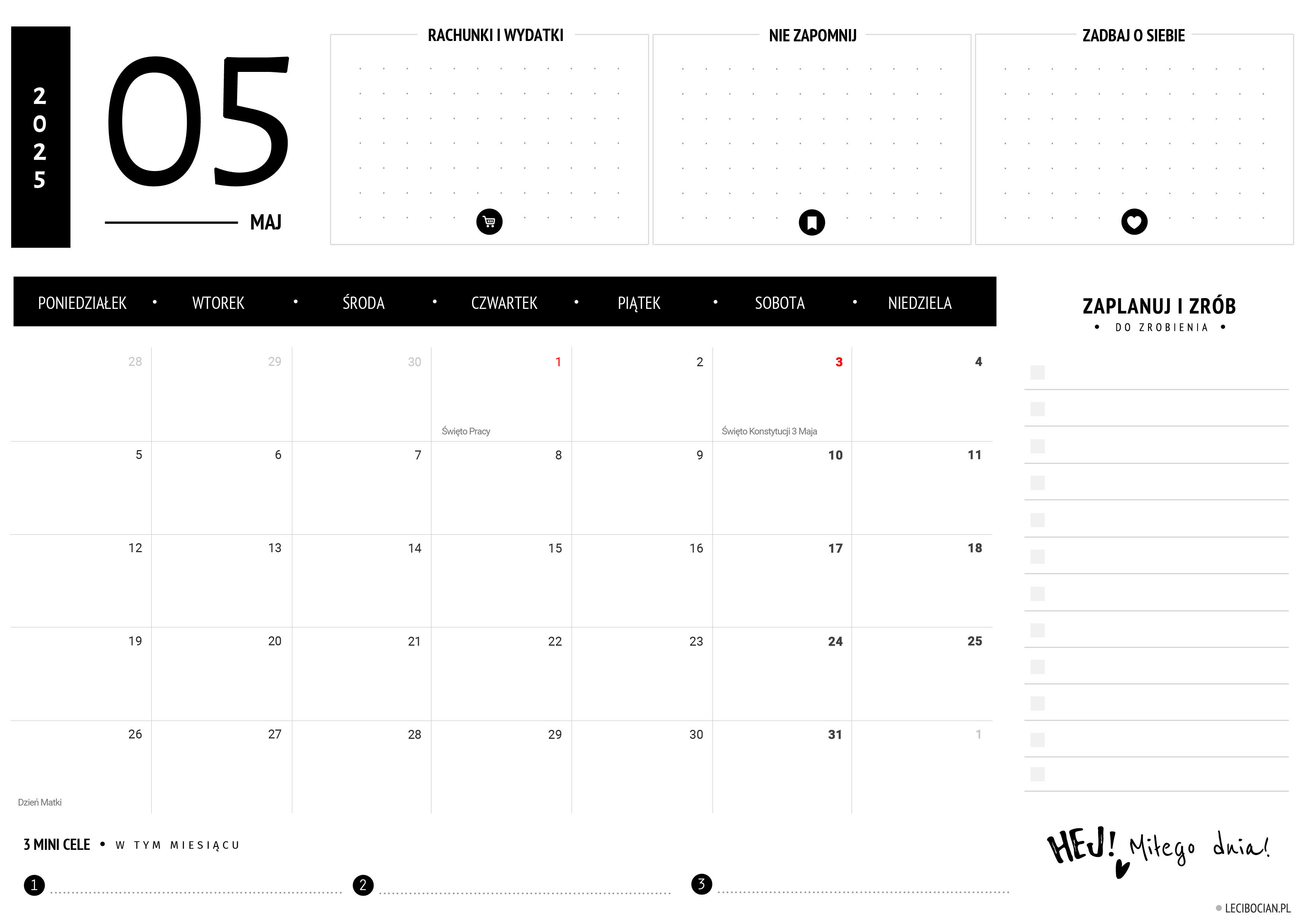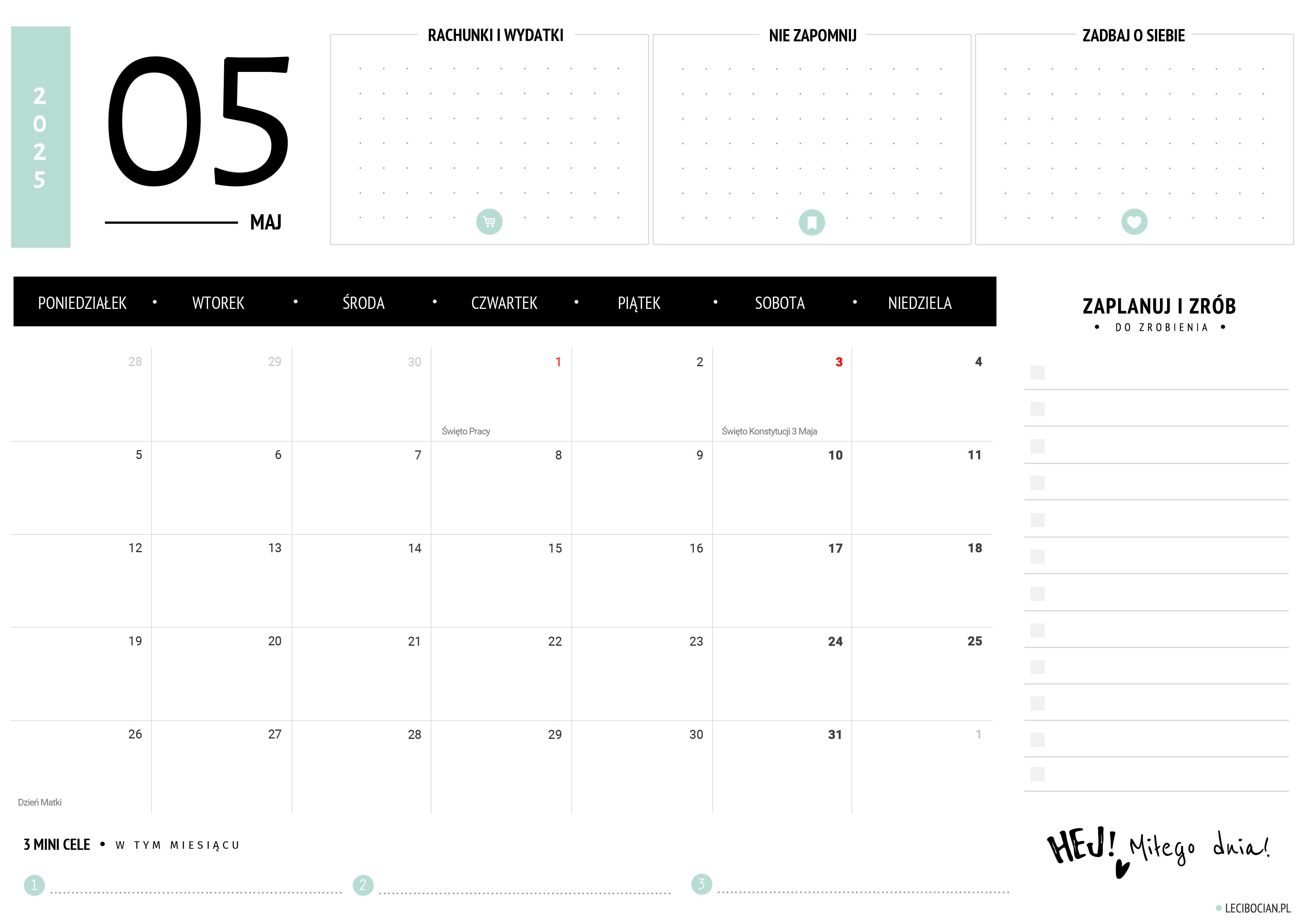 Darmowy planer maj 2025 do druku. Pobierz bezpłatny planer z kalendarzem na maj 2025 do wydrukowania. Lista zadań, cele miesiąca, czytelny kalendarz.
