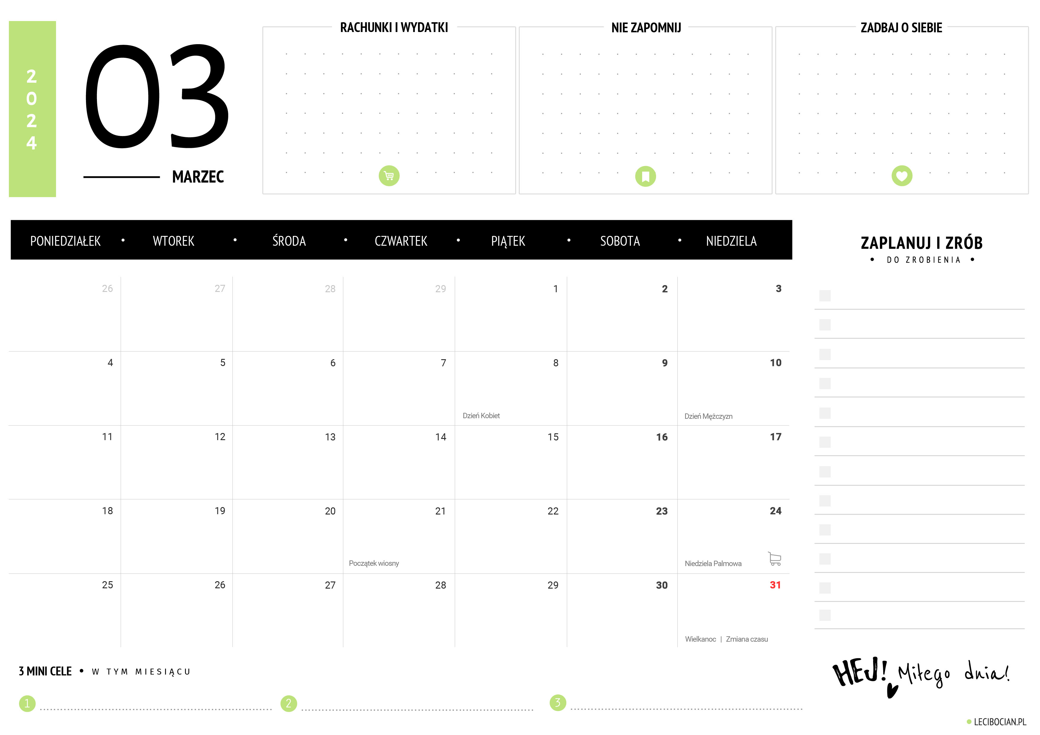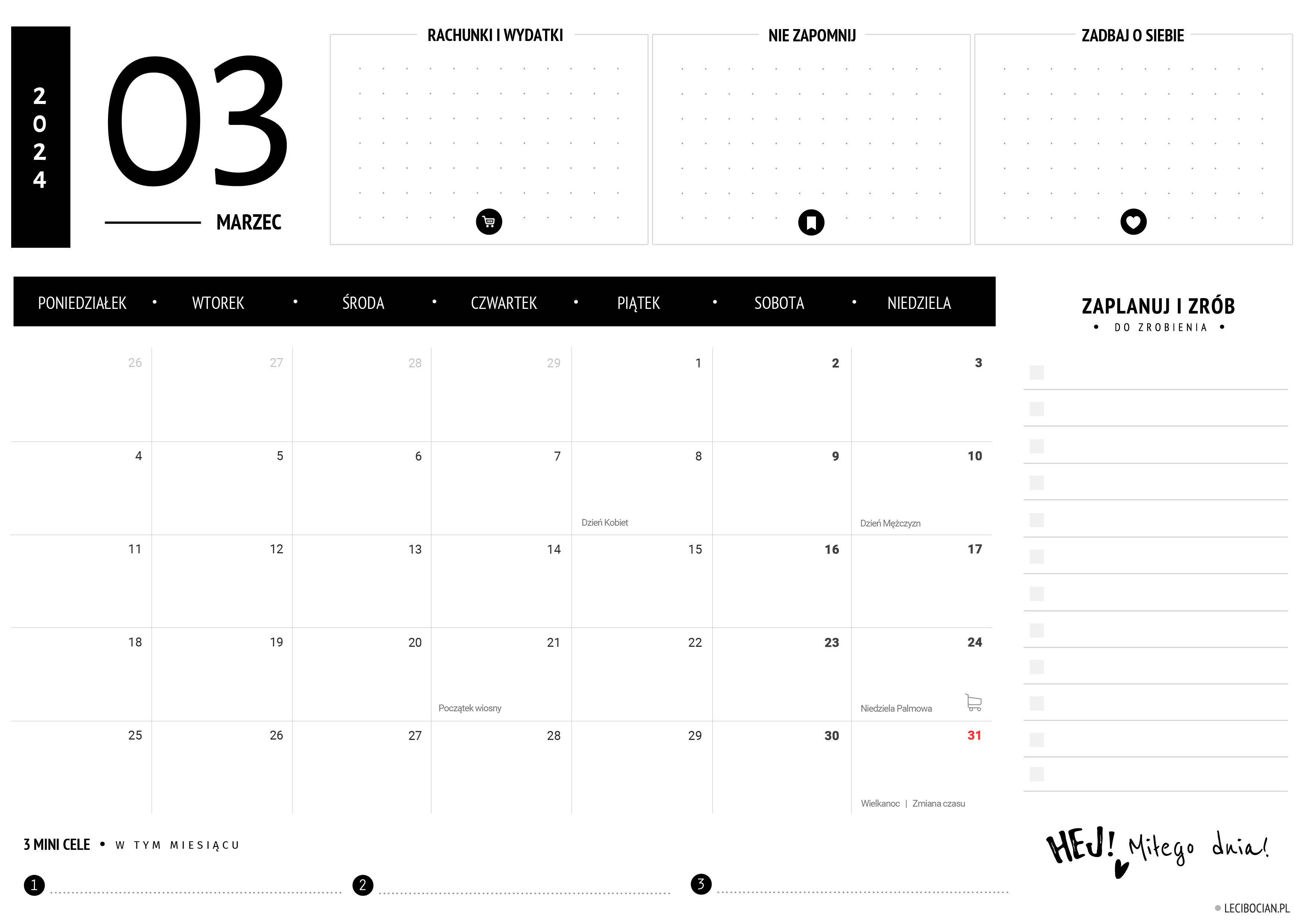 Darmowy planer marzec 2024 do druku. Pobierz bezpłatny planer z kalendarzem na marzec 2024 w różnych wersjach. Lista zadań, cele miesiąca, czytelny kalendarz.