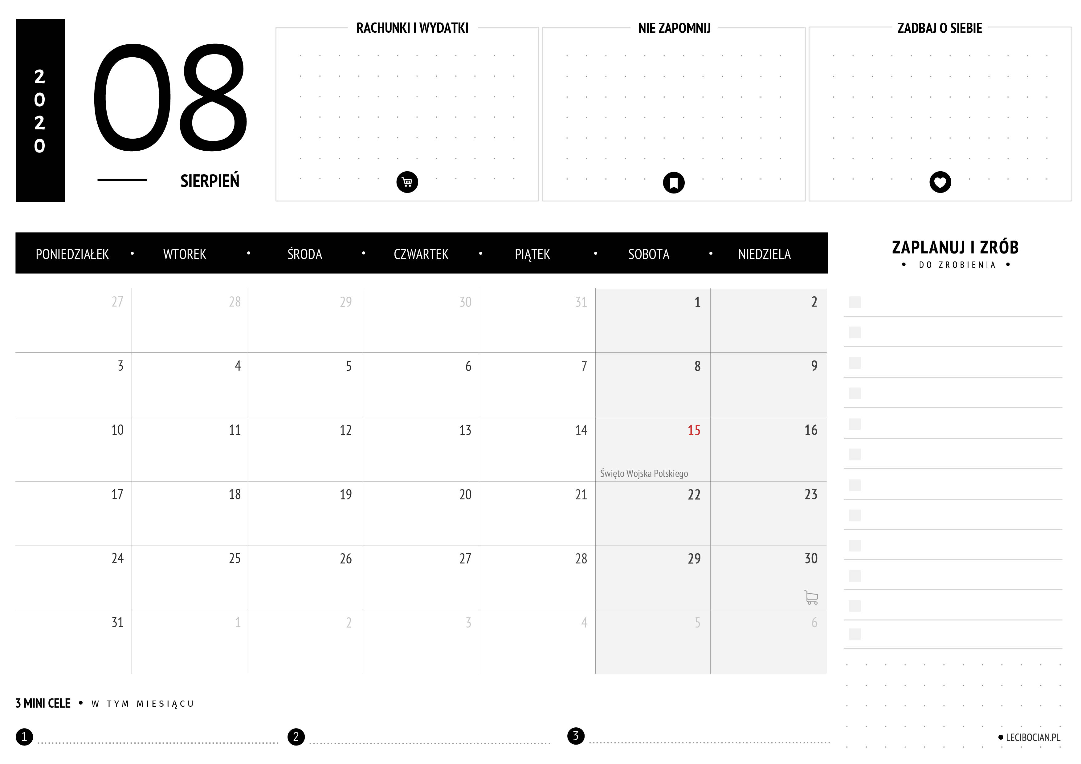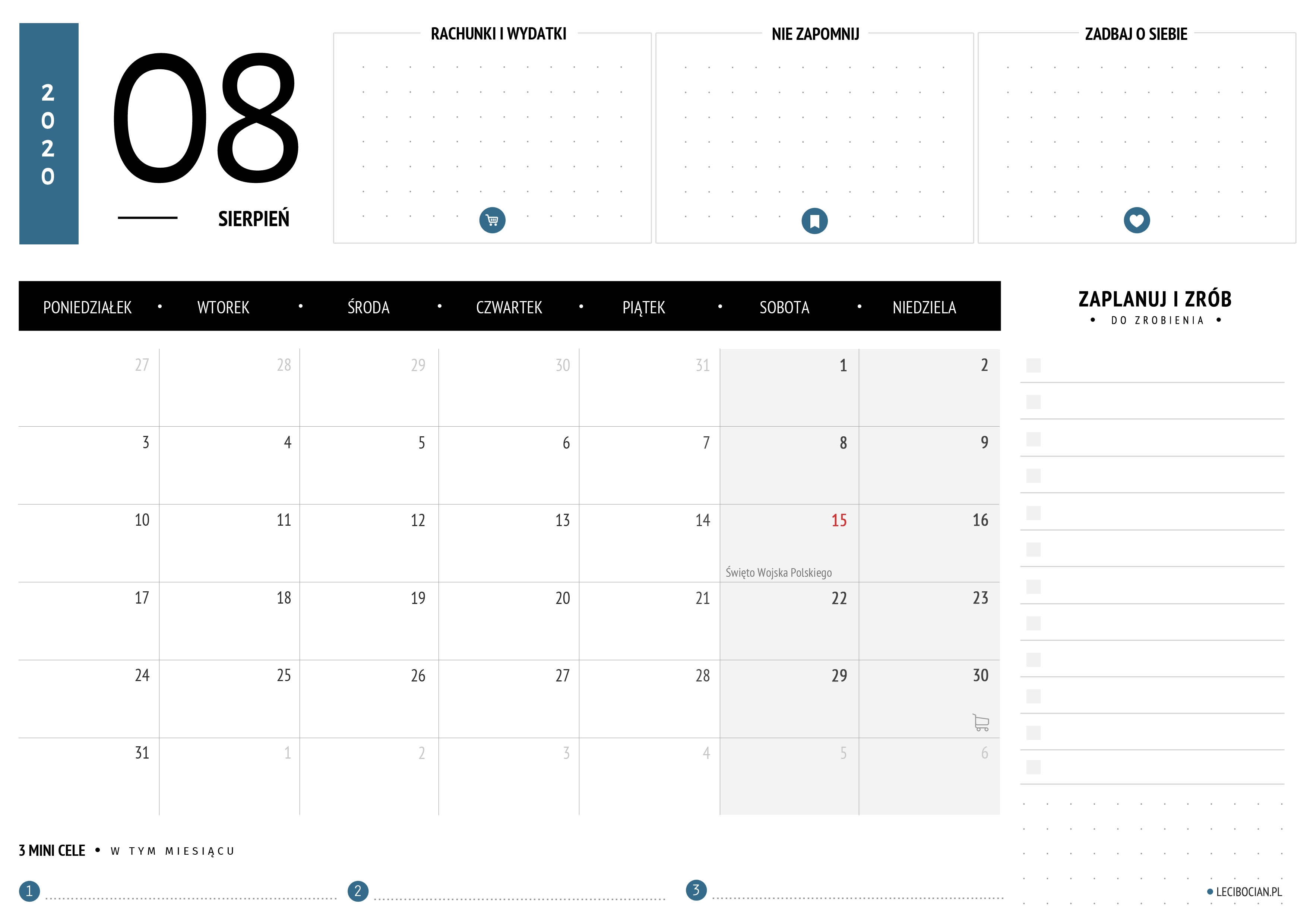 Darmowy planer do druku sierpień 2020. Pobierz bezpłatny planer do wydrukowania sierpień 2020. Miesięczny planer z listą zadań i ważnymi celami na sierpień! Wybierz swój planer i wydrukuj!