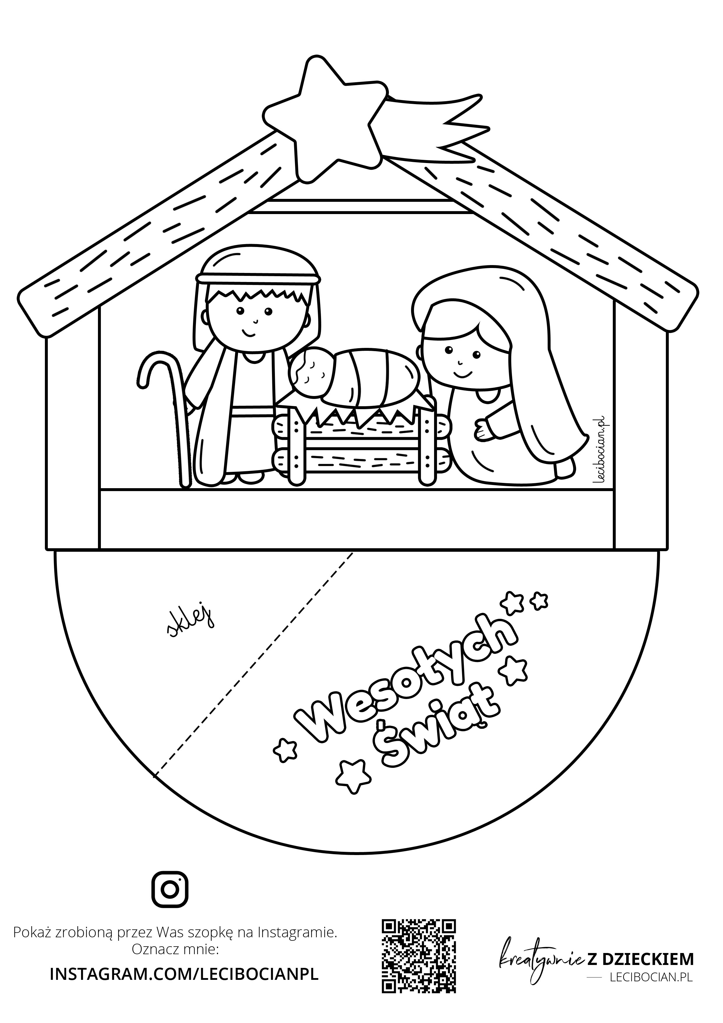 Na szopce znajdziecie gwiazdę betlejemską, stajenkę, małego Jezusa, Józefa i Maryję. Nie zabrakło również napisu Wesołych Świąt. Szopkę możecie wyciąć i pokolorować razem z dziećmi. Może być ona dekoracją, ale też fajnym prezentem dla bliskich zrobionym własnoręcznie na Święta.