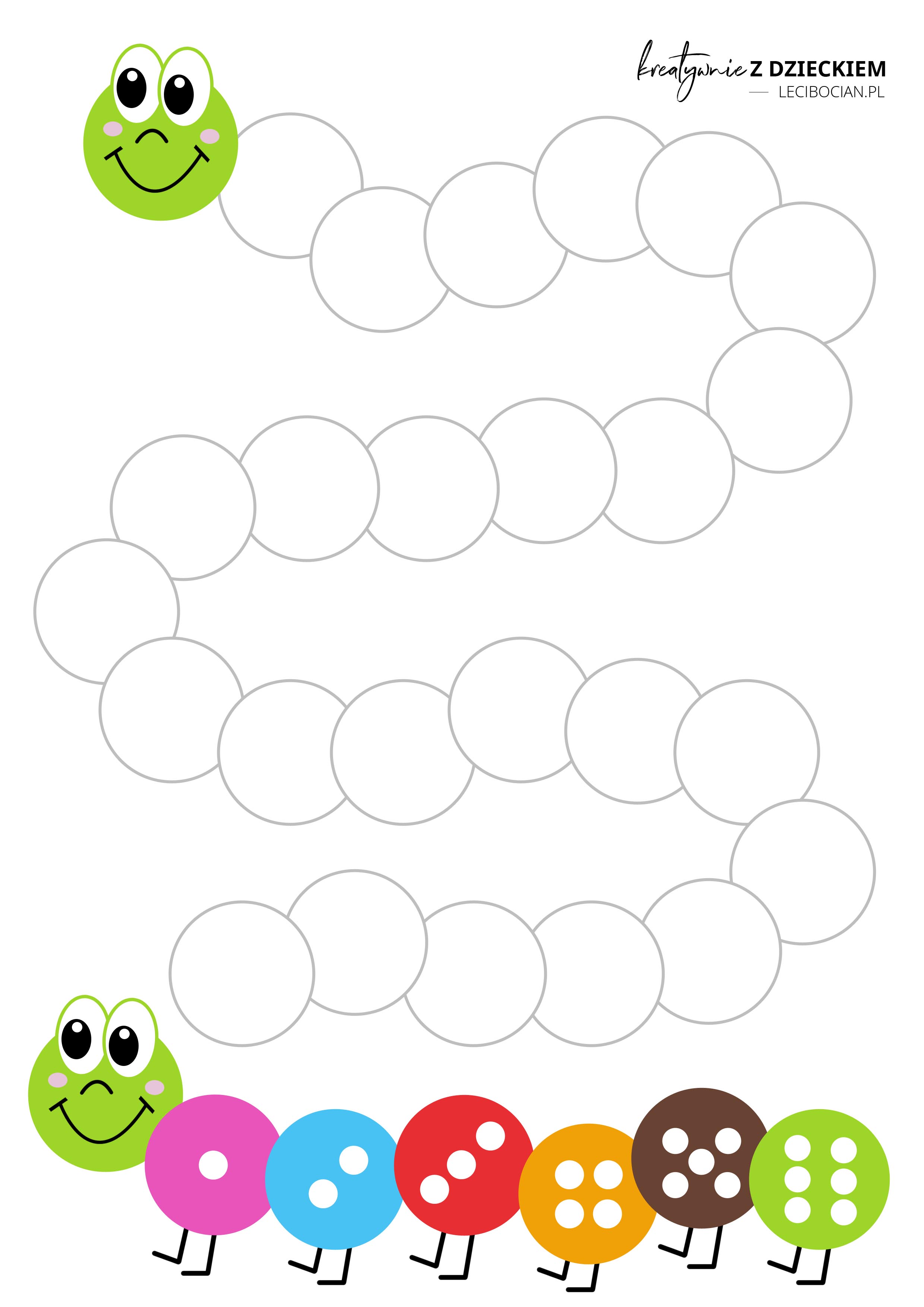 Pomyślałam, że można by połączyć grę z kolorowanką. Na szybko pomiędzy smarowaniem kolejnych krostek i opieką nad młodszym maluchem zrobiłam wesołą gąsienicę, która była u nas hitem przez cały dzień, a to było na wagę złota 🙂