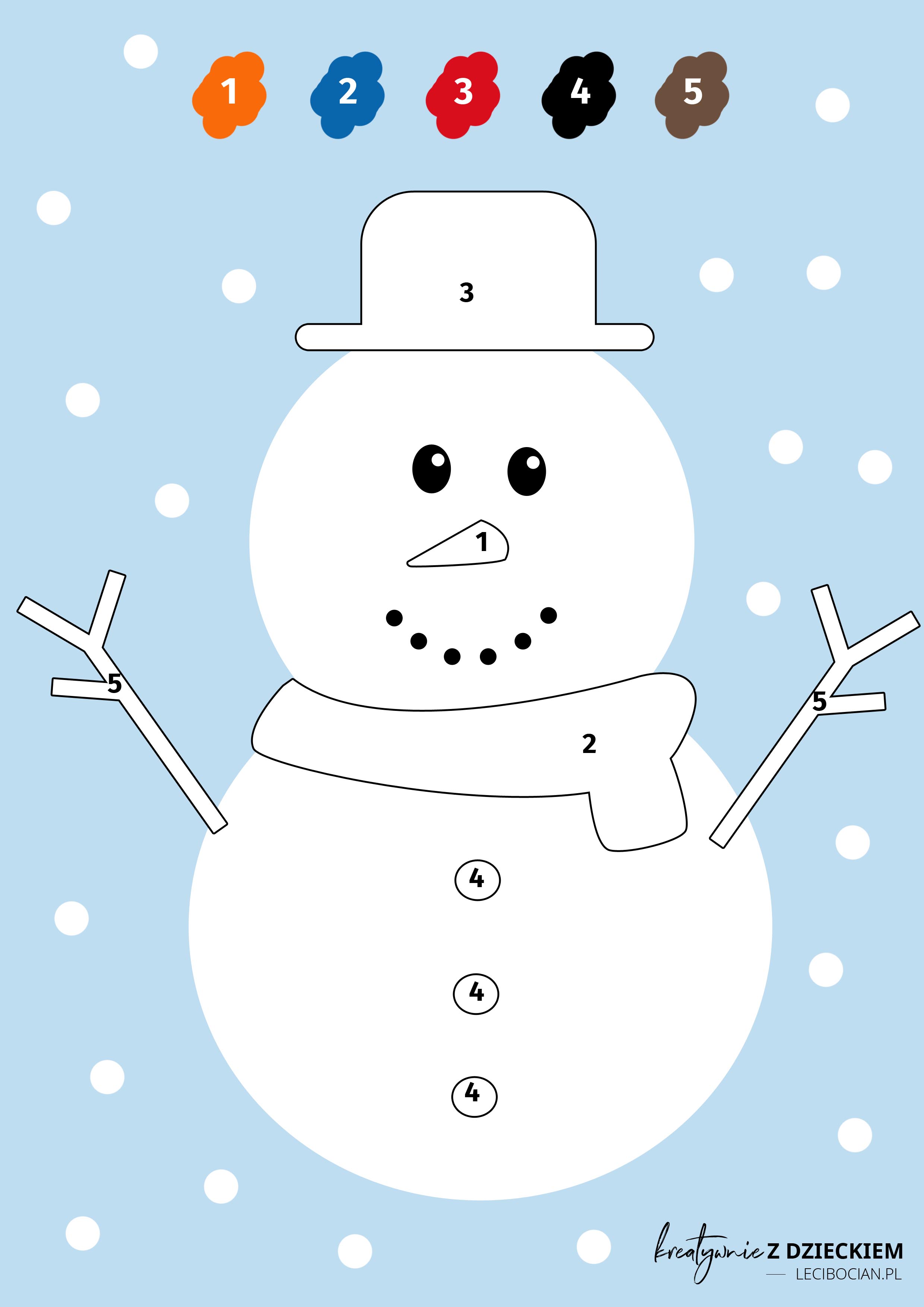 Na drugiej wyklejance znajdziecie bałwana, a raczej 2 śnieżne kule, bo Wasze dzieci muszą wykleić mu guziczki, marchewkowy nos, patyczkowe ręce, czapkę i szalik. Muszą go uzupełnić tak żeby powstał prawdziwy śnieży bałwan. W jakich kolorach należy to zrobić podpowiedzą numerowe oznaczenia.